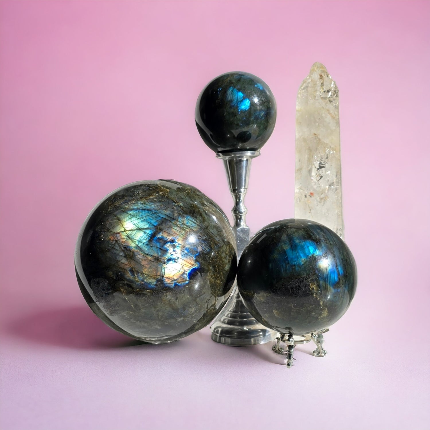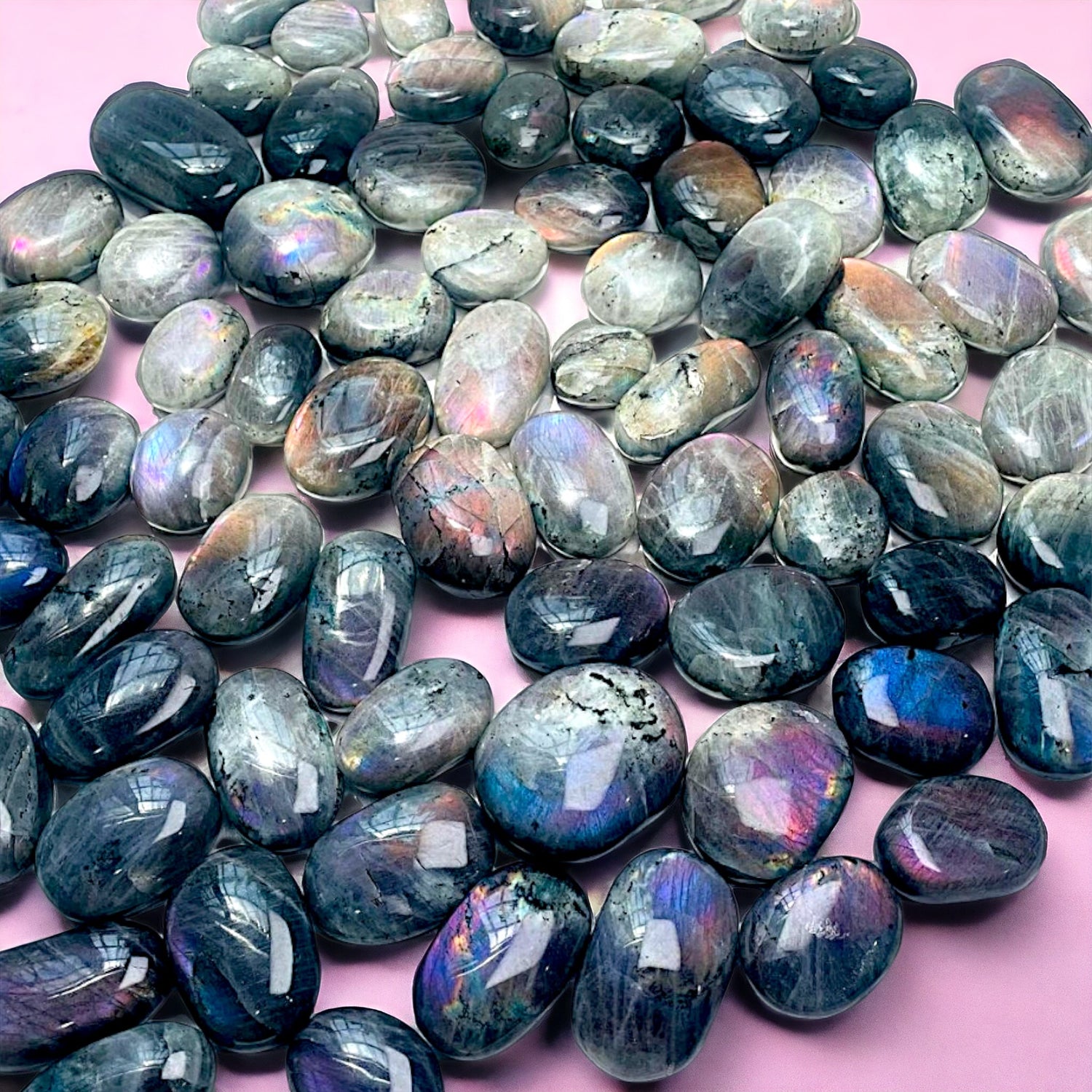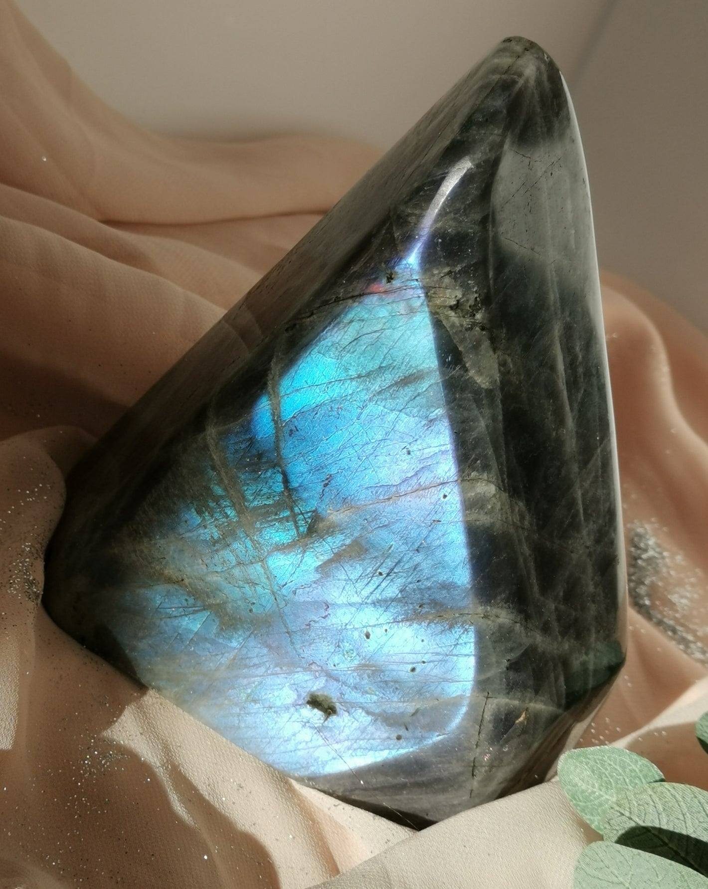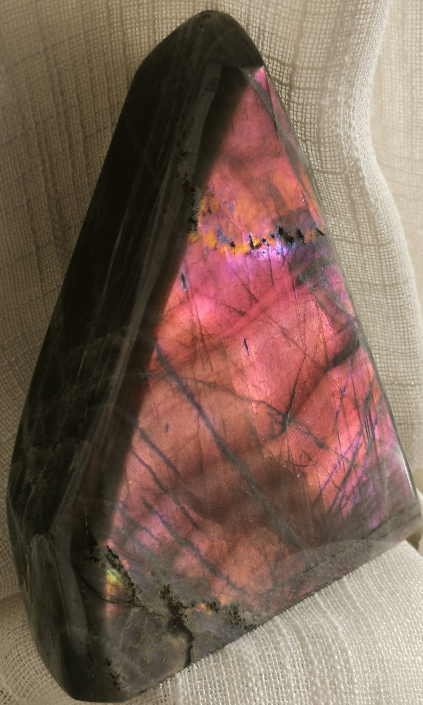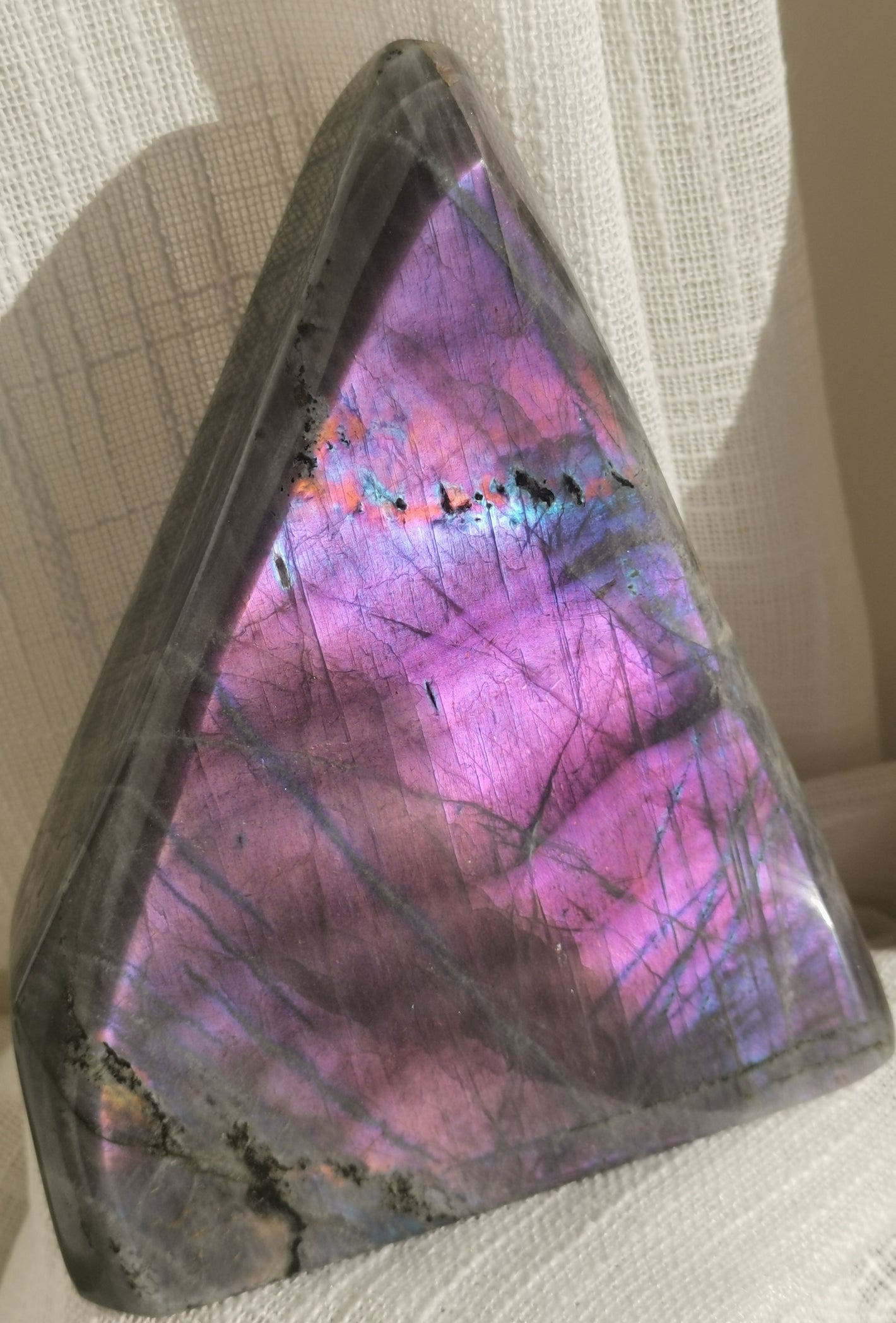 Labradorit i lila, rosa samt blått . Unik samlarsten i freeform. Ibland får vi in unika objekt som dessa så håll utkik.
