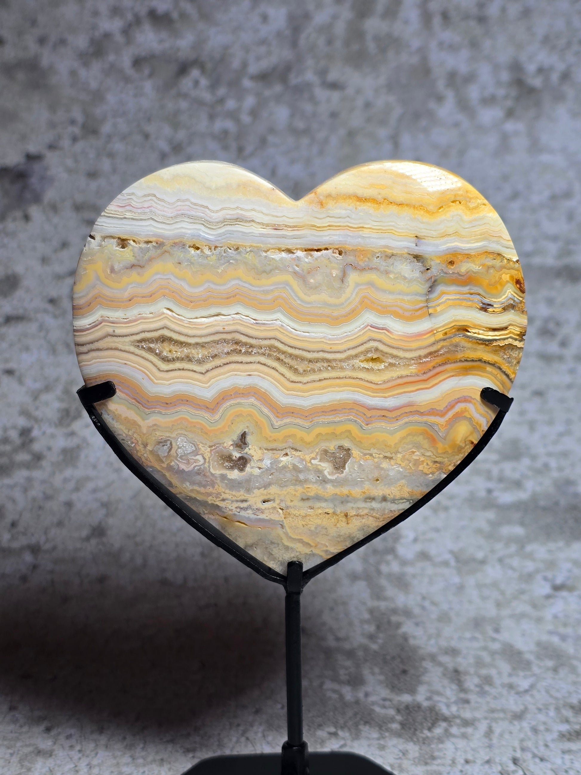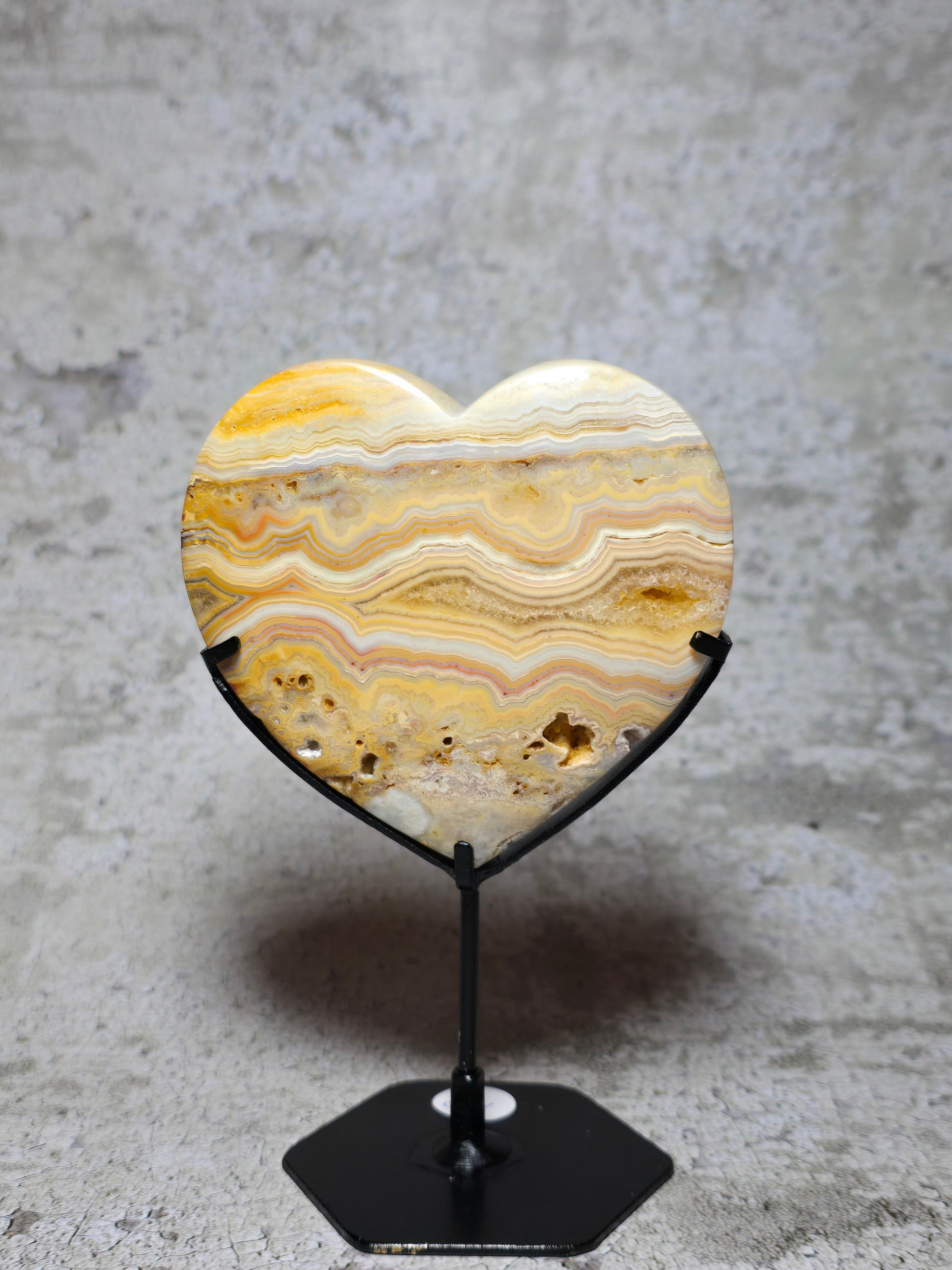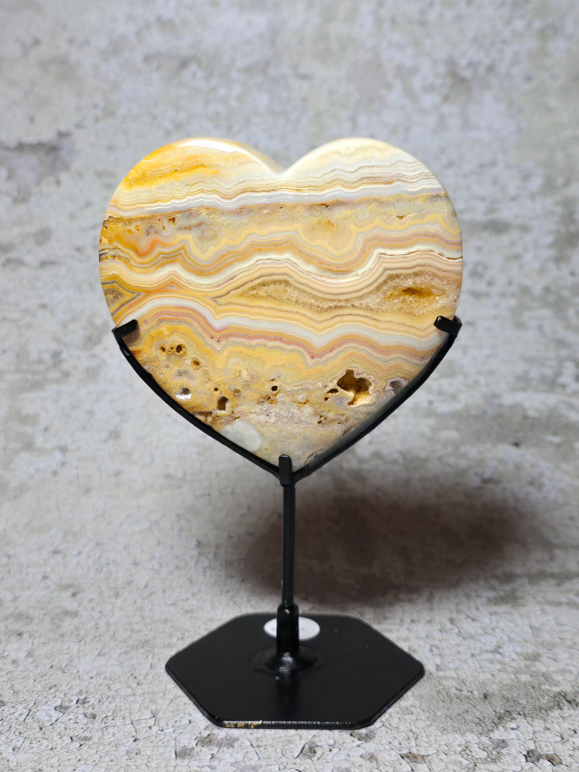 Letar du efter nått vackert att pryda ditt sidobord eller fönster med? Vackert gult crazy lace agat hjärta med massa druzy & härligt mönster.