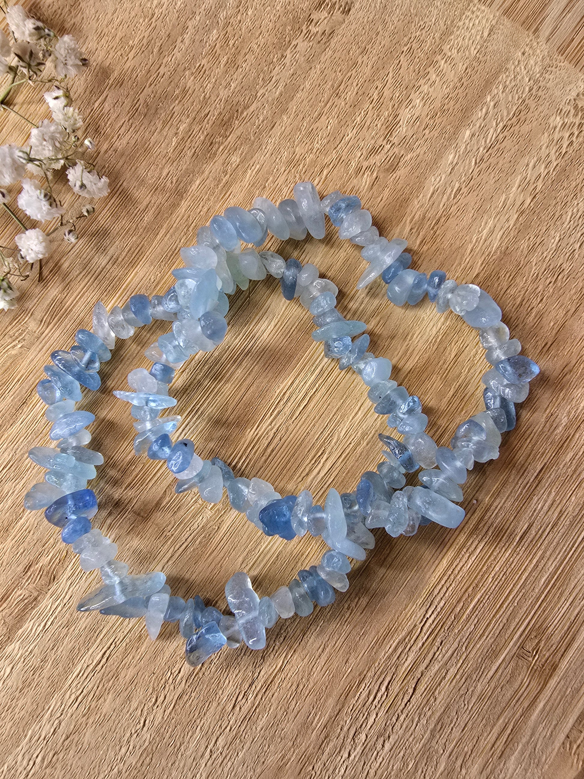 Detta armband bär energin av ett stilla, kristallklart hav. Akvamarin i rå chipsform är ren, mjuk och otämjd, precis som intuitionen när den får flöda fritt. Varje liten chip är som en våg som sköljer genom kroppen och löser upp tryck över bröstet, oro i maggropen och mentalt brus. Energin öppnar halschakrat, mjukar upp kommunikationen och hjälper dig att uttrycka det som är sant för dig – utan rädsla, utan stress, utan att kompromissa med din själ.