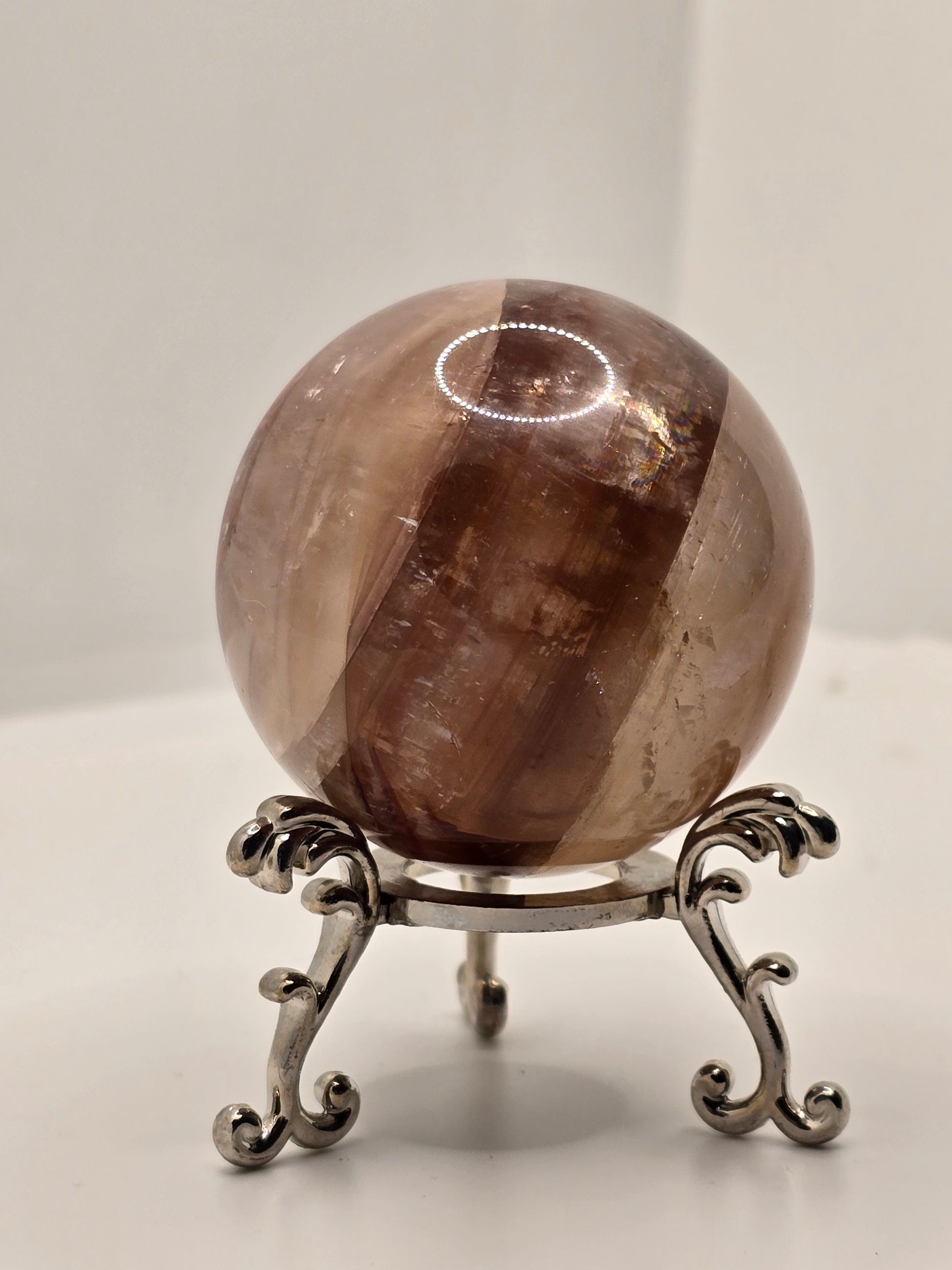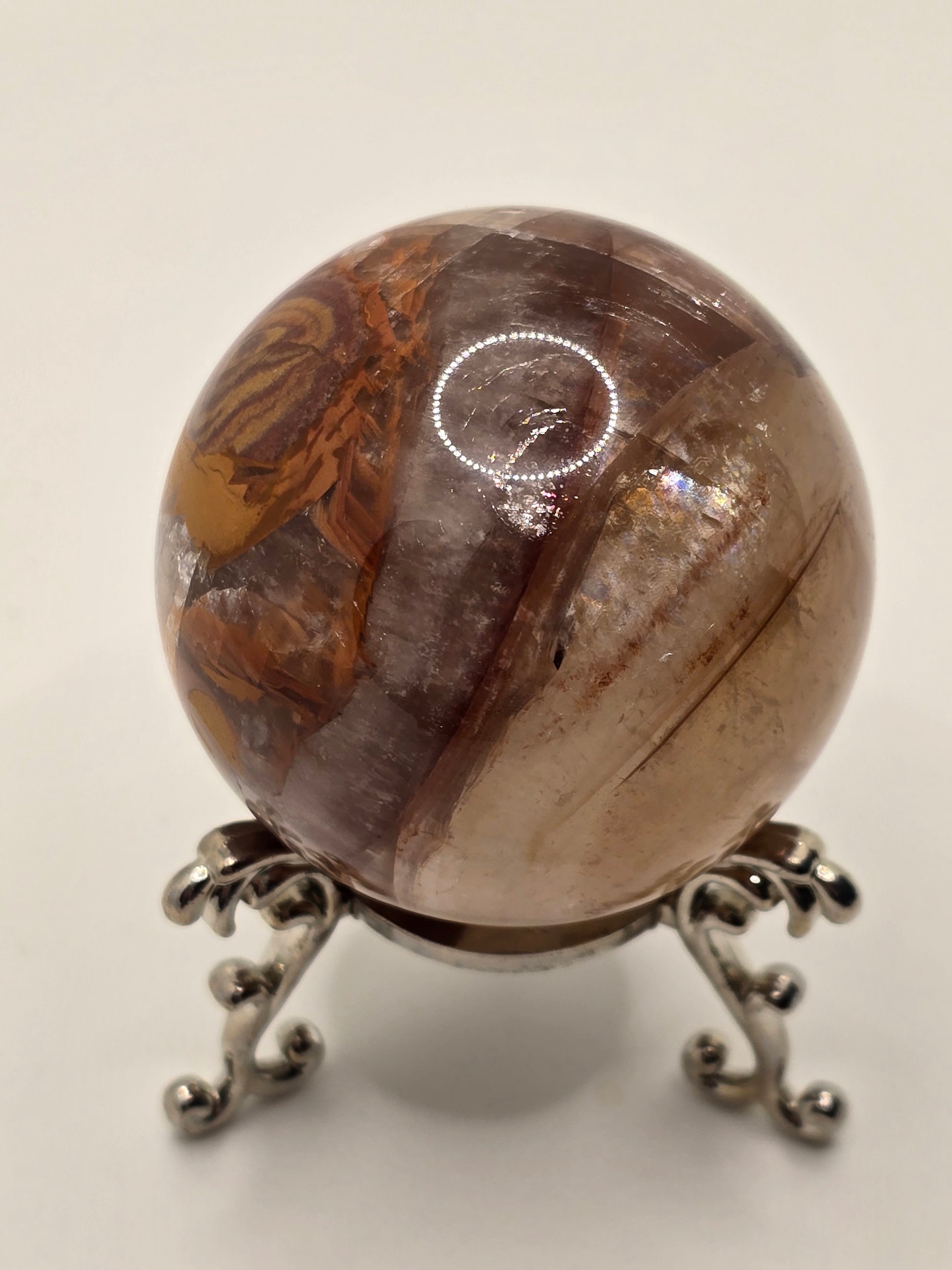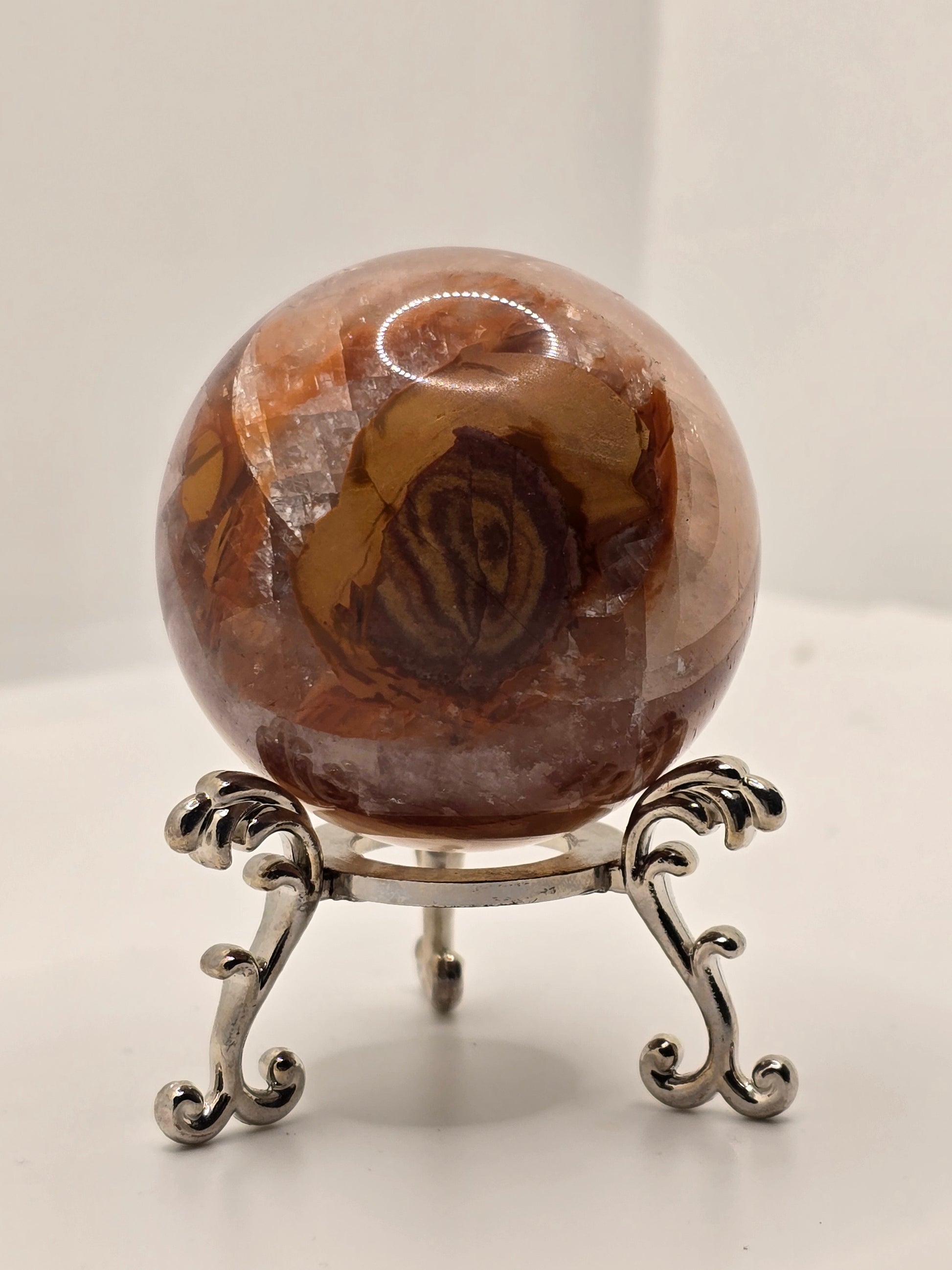 Ett kraftfullt honungskalcit-klot med dramatiska naturliga järninslag som skapar unika mönster i varma toner av honung, bärnsten och jord. Djupet i stenen ger en nästan levande känsla – varje vinkel visar nya strukturer och lager.