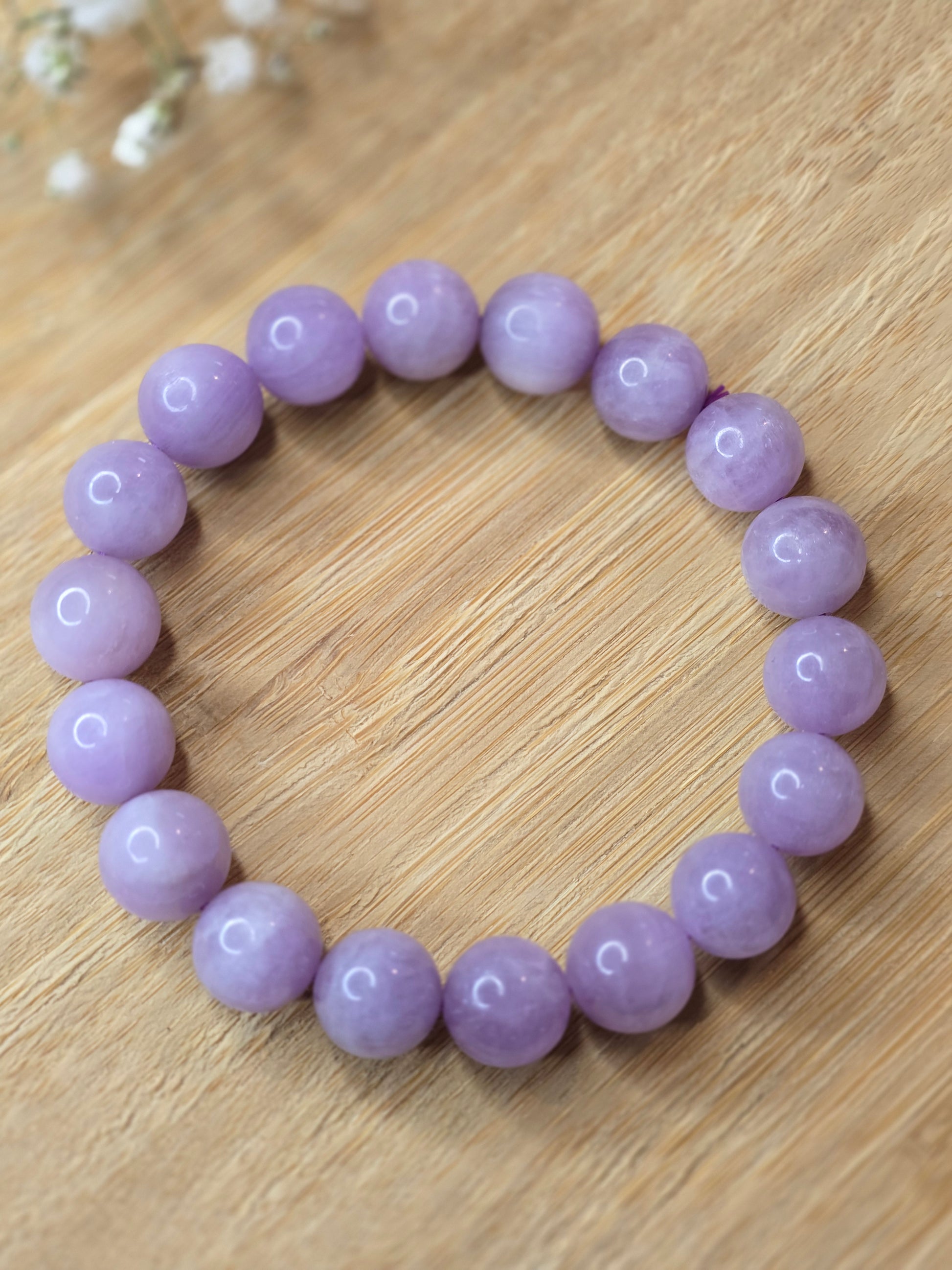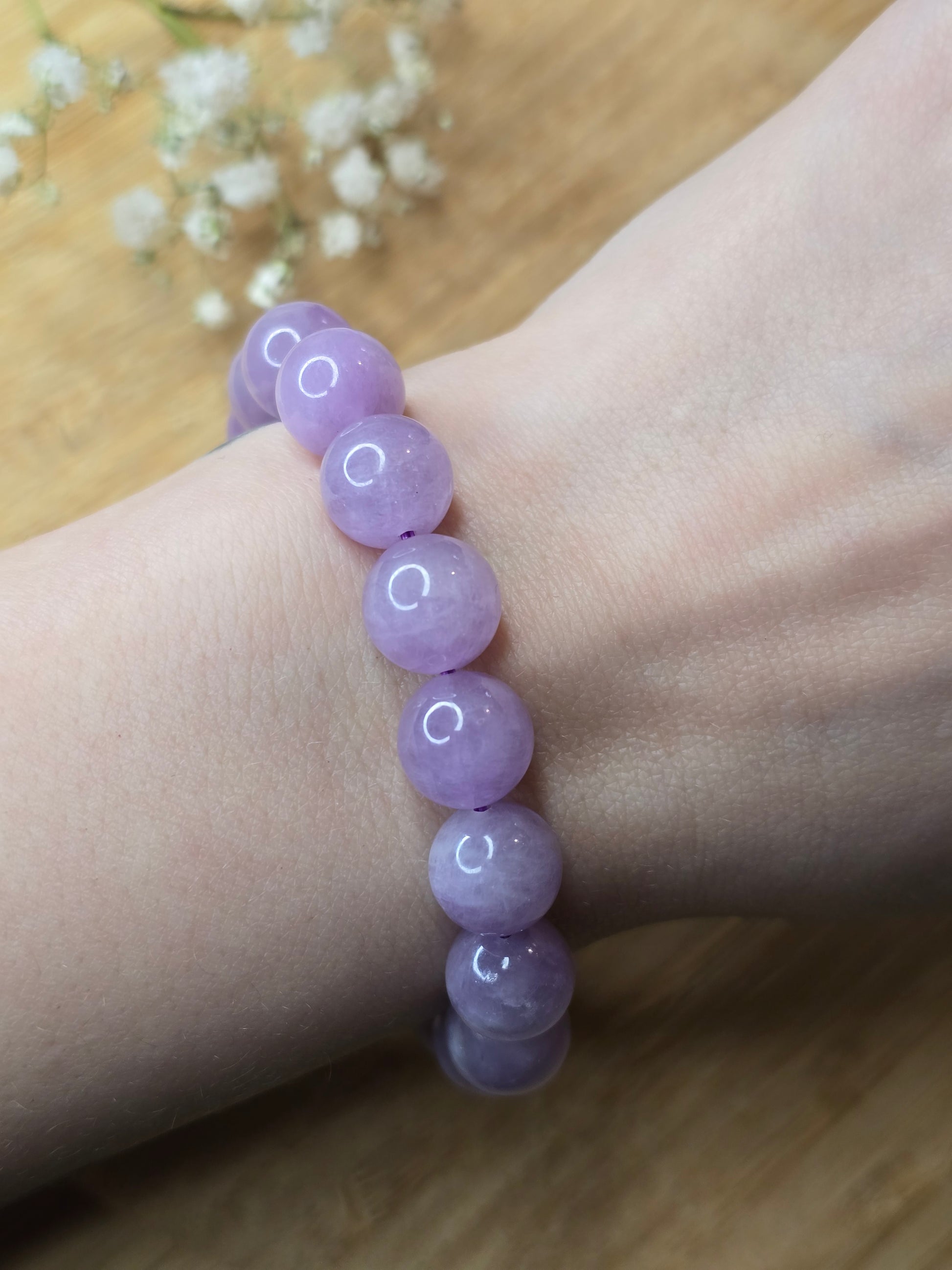Detta armband bär den rena hjärtenergin från Kunzit – en sten som lyser inifrån med mjuk, violett rosenskydd och stilla själskraft.