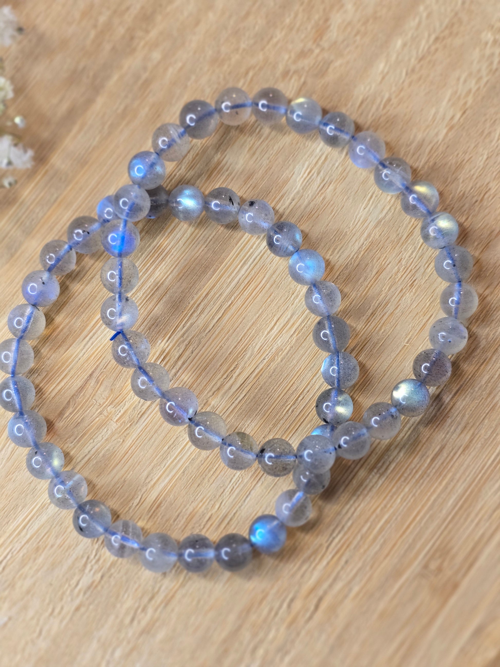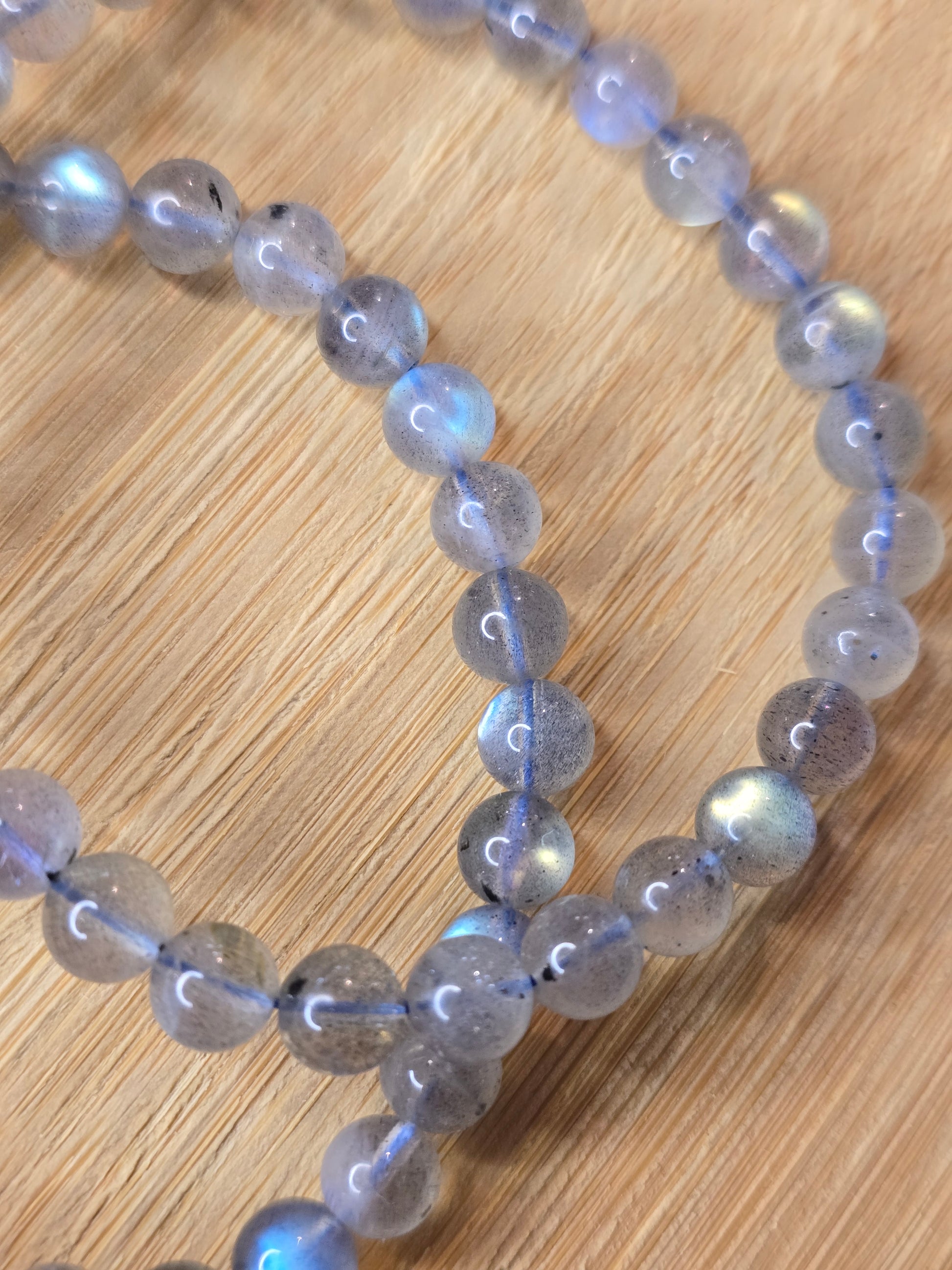 Detta armband i AAA-labradorit bär ett eget inre universum. Varje pärla glimmar med blå och silvergrå flammor som tänds när ljuset rör vid stenen — som små portaler till din intuition. Labradorit är stenen som väcker klarhet, guidning och energiskt skydd, och den fungerar som en mjuk sköld som både höjer din frekvens och stänger dörrar mot sådant som inte längre får ta av din kraft.
