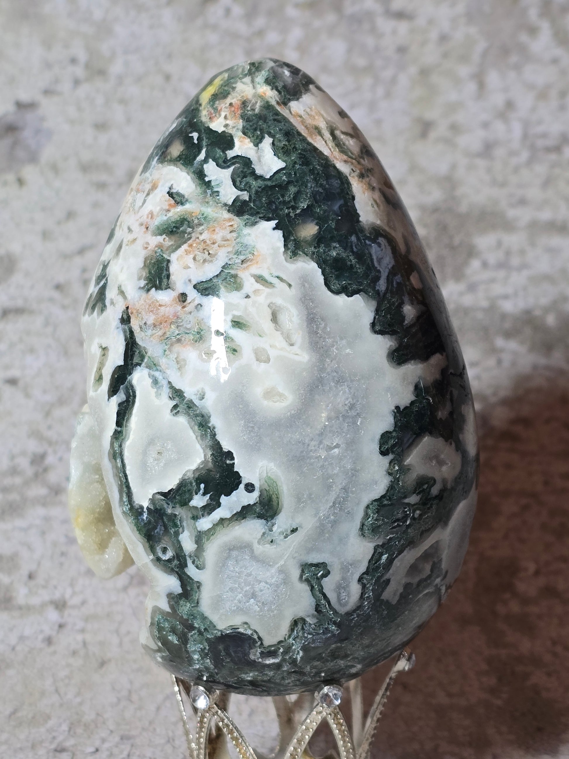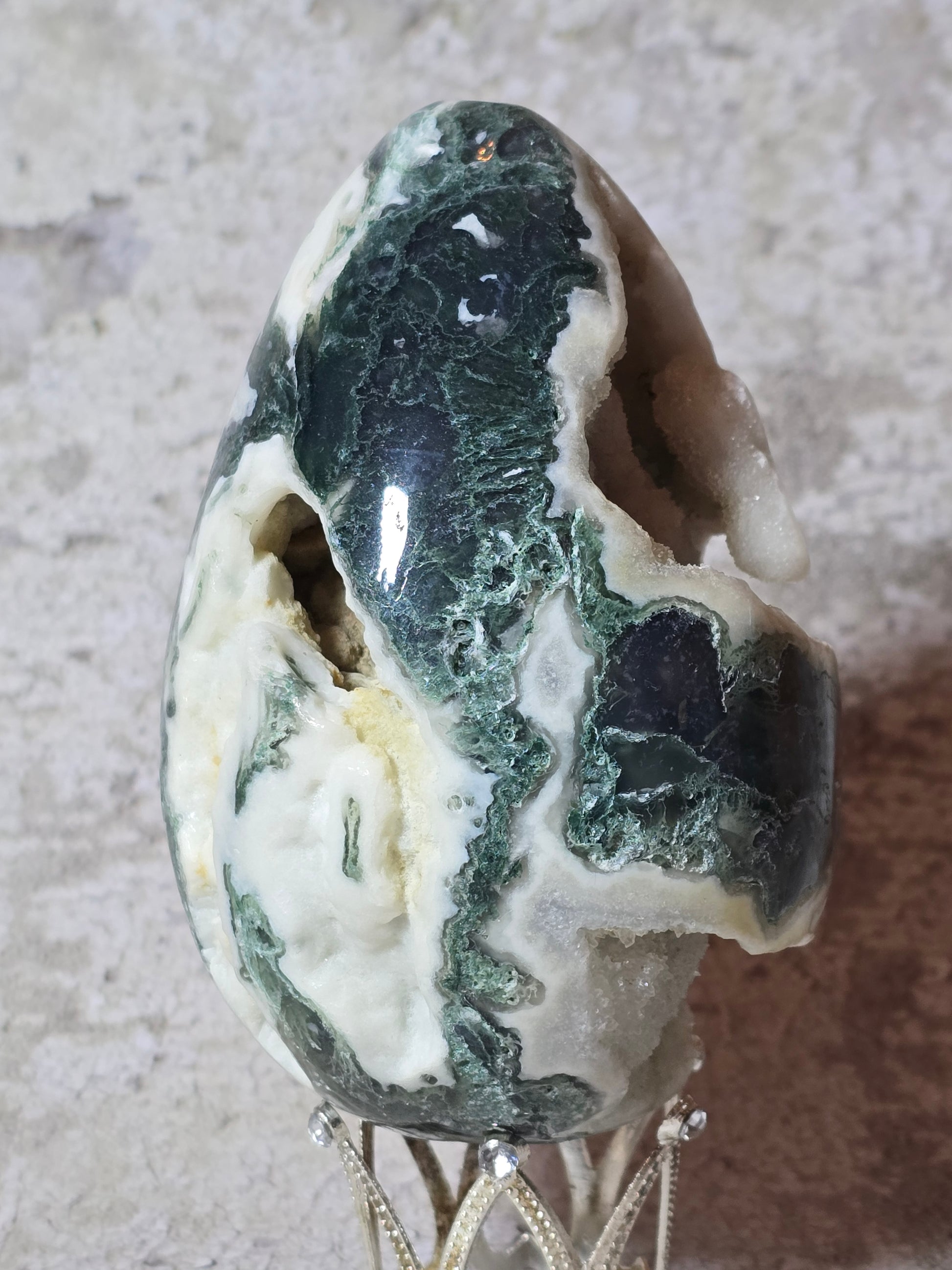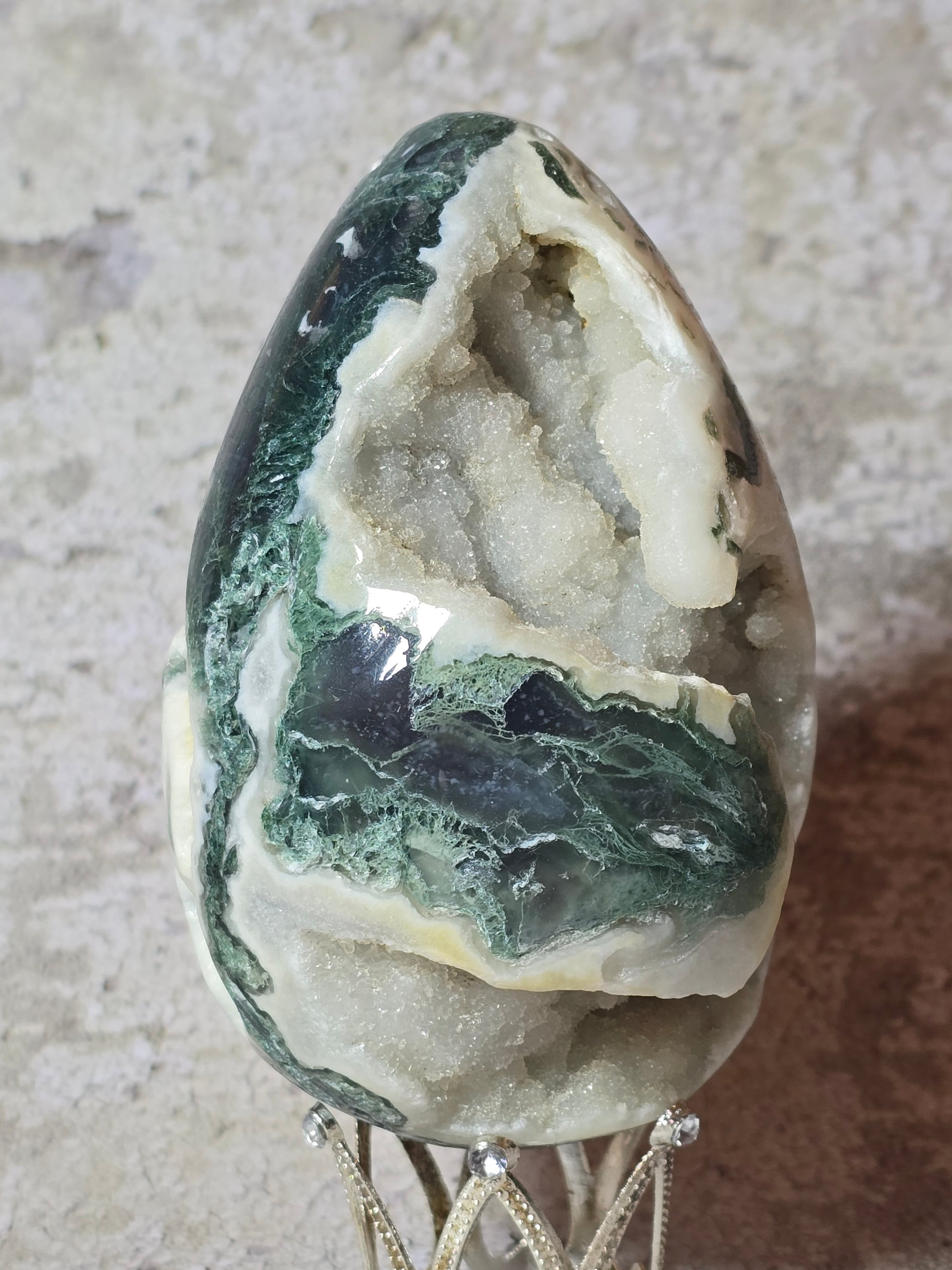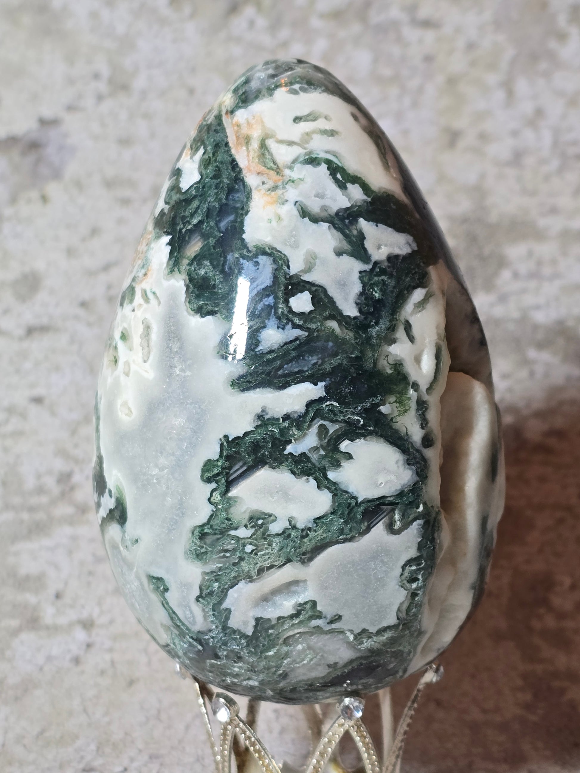 Mossagat förknippas med stabilitet, jordning och naturlig utveckling. I äggform symboliserar den potential och nya början – en kraftfull kombination för dig som vill skapa trygg grund och samtidigt ge utrymme för tillväxt.
