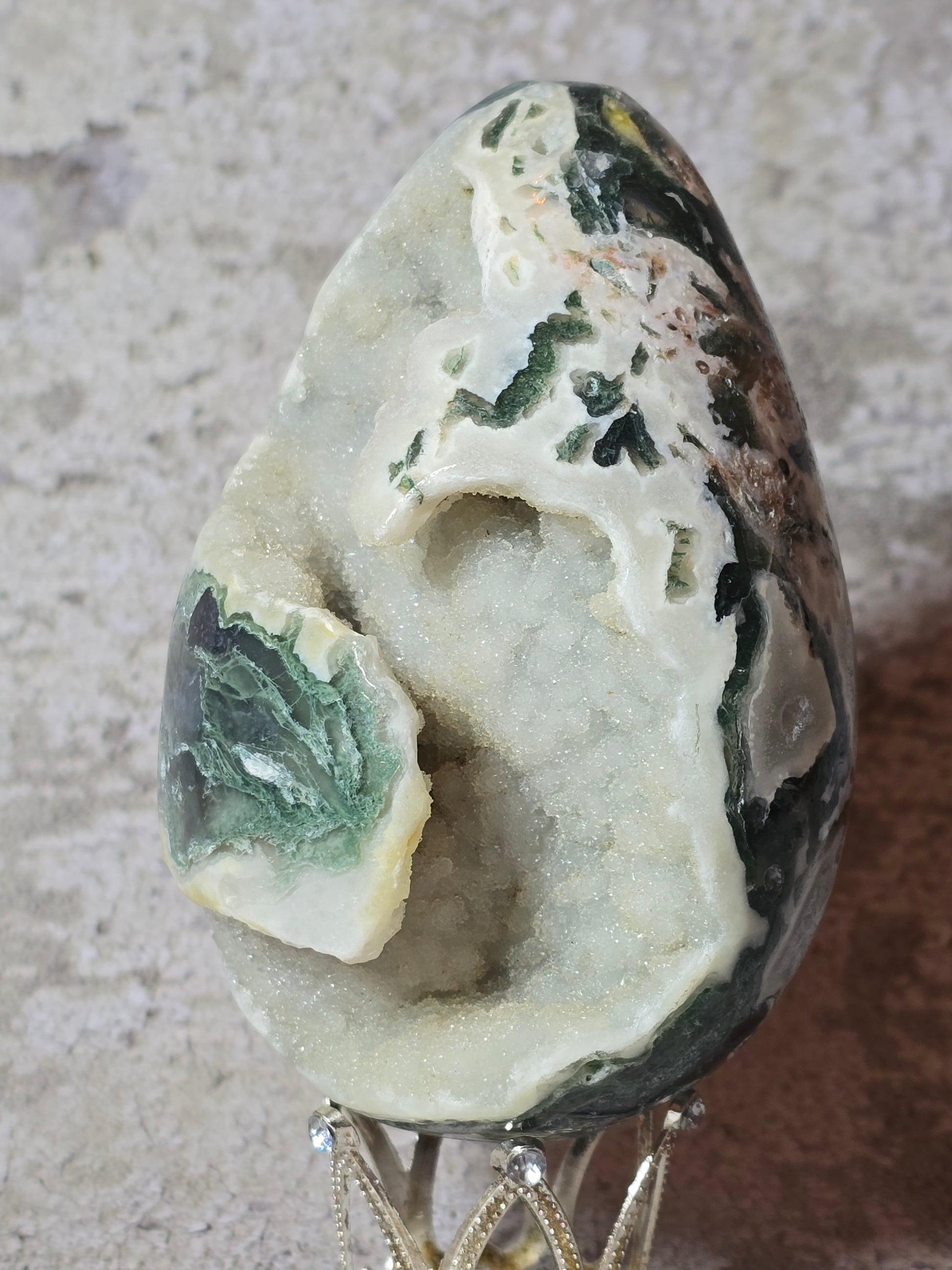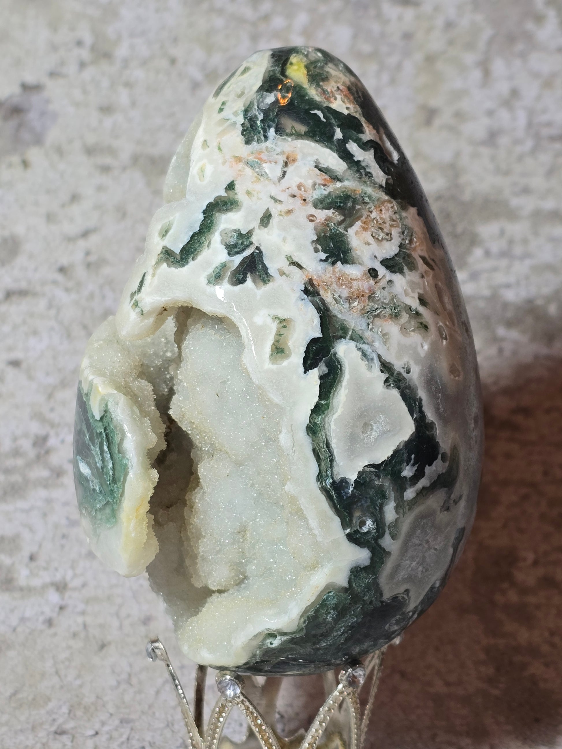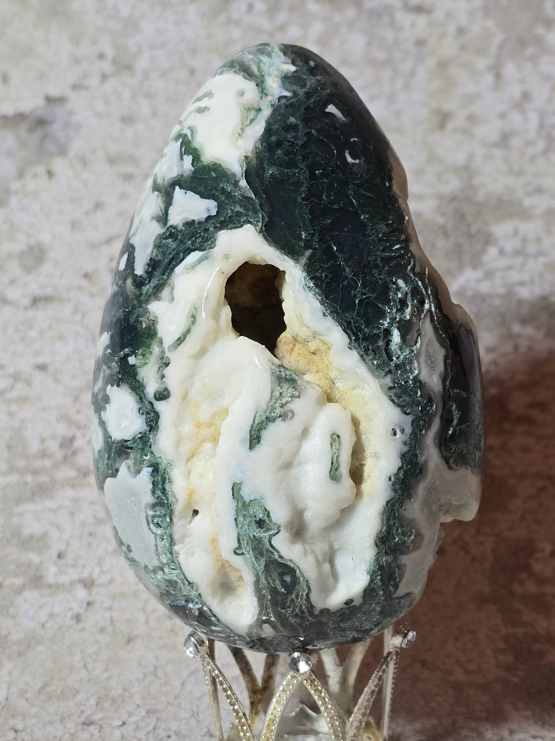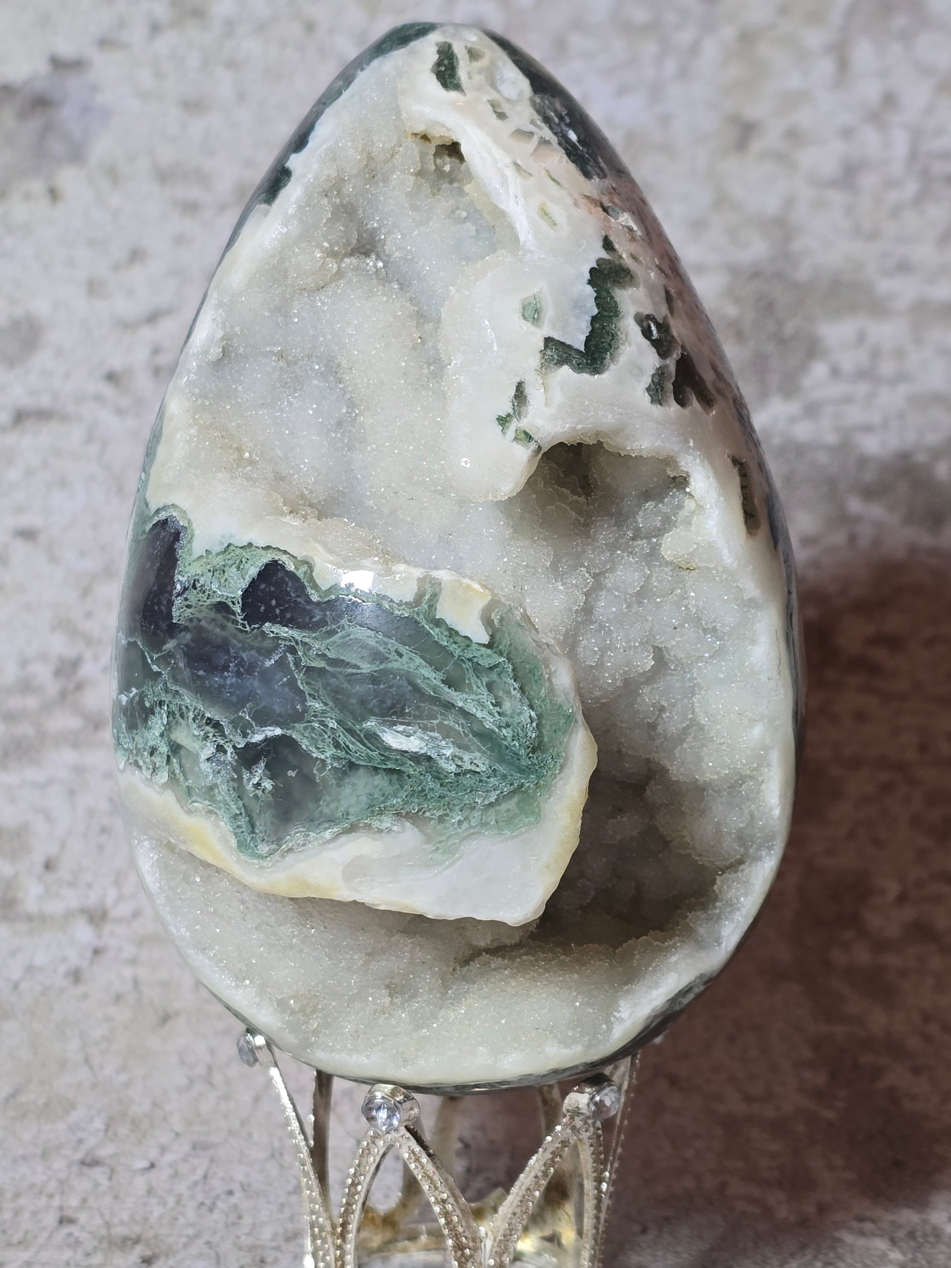 Mossagat förknippas med stabilitet, jordning och naturlig utveckling. I äggform symboliserar den potential och nya början – en kraftfull kombination för dig som vill skapa trygg grund och samtidigt ge utrymme för tillväxt.