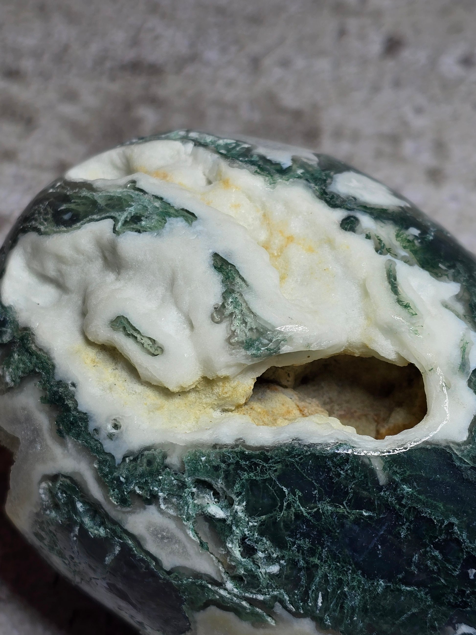 Detta större mossagatägg bär en tydlig närvaro och tyngd. De gröna, organiska mönstren påminner om mossa och växtlighet och för tankarna till naturens lugna, stadiga rytm.