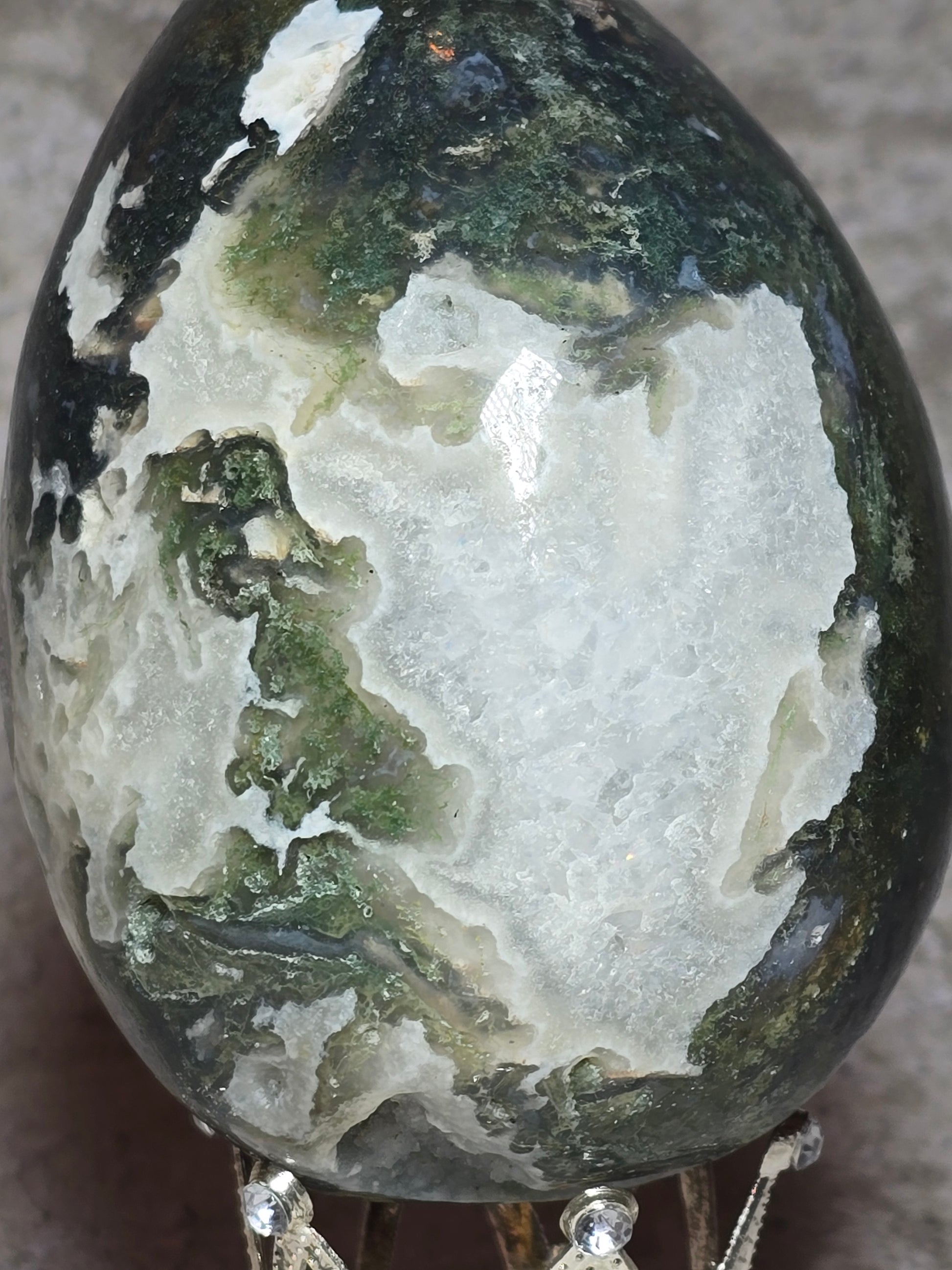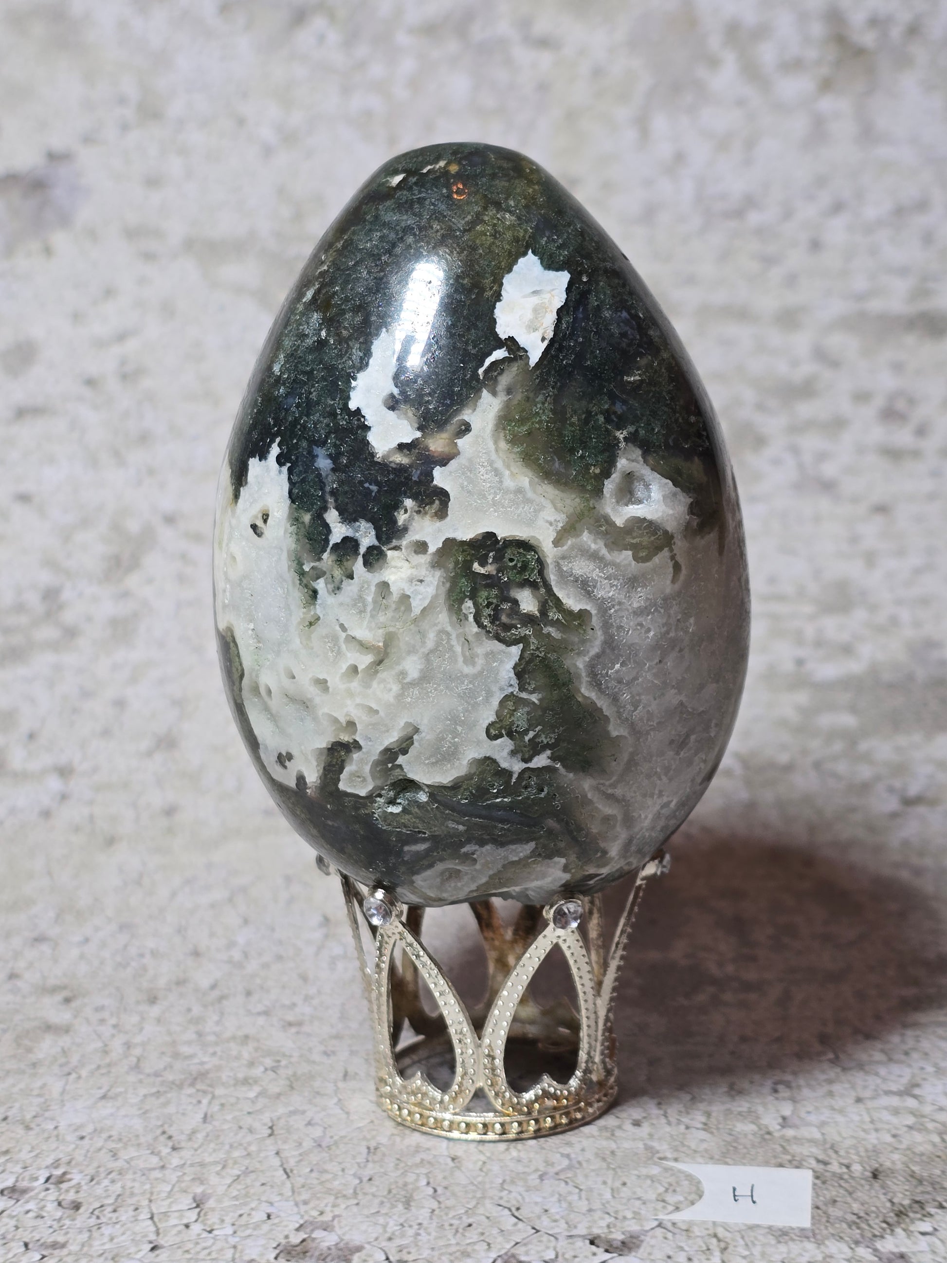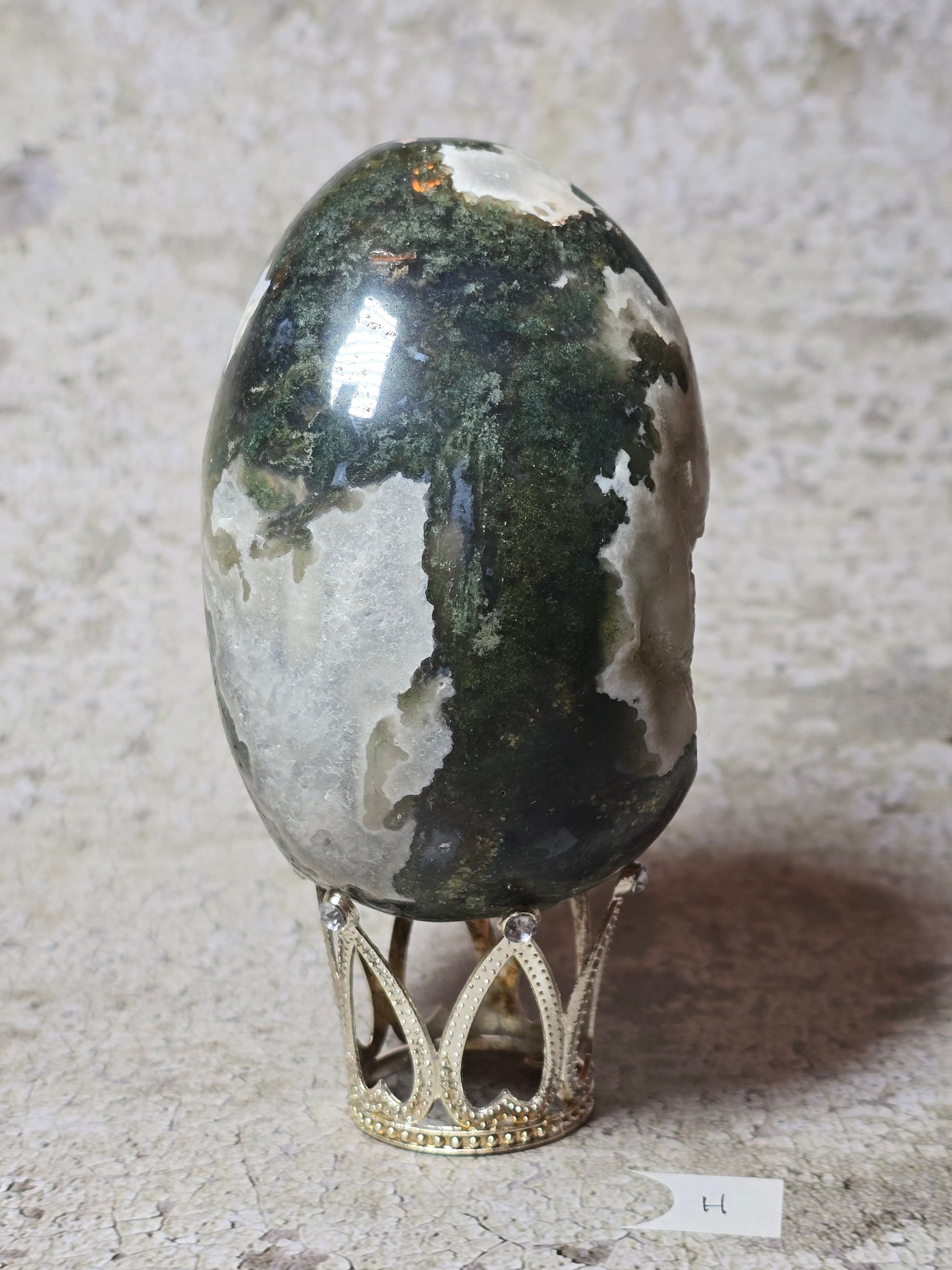 Detta mossagatägg bär naturens lugn i fast form. De gröna mönstren påminner om växtlighet och jord, och stenen förknippas med stabilitet, balans och ny tillväxt.