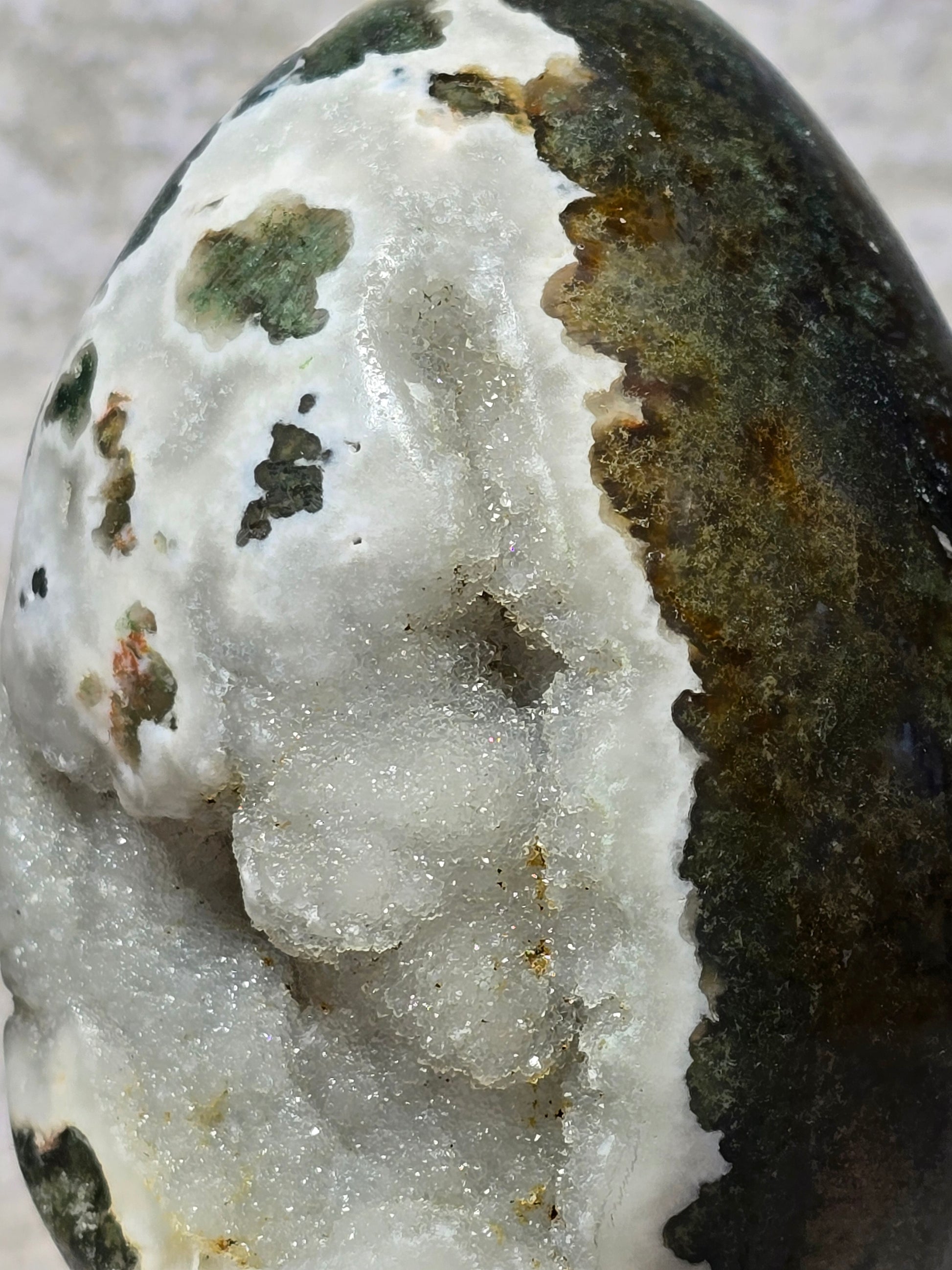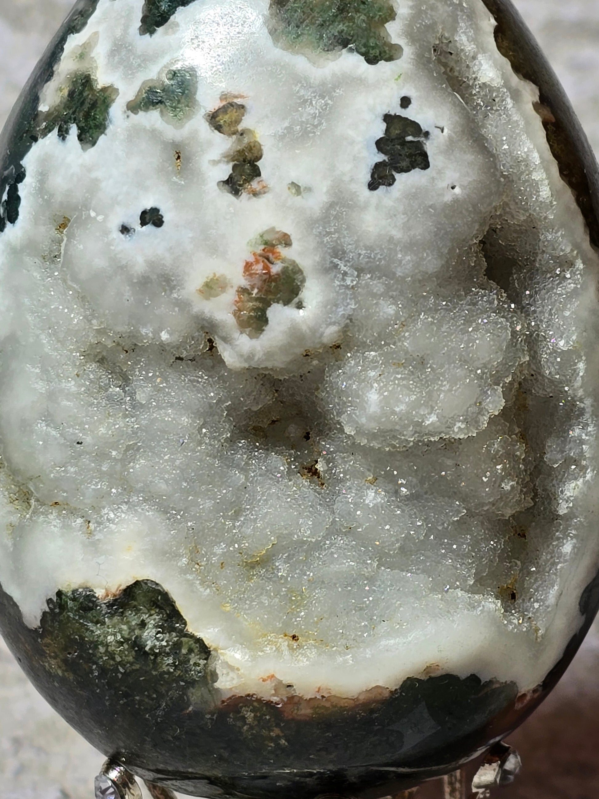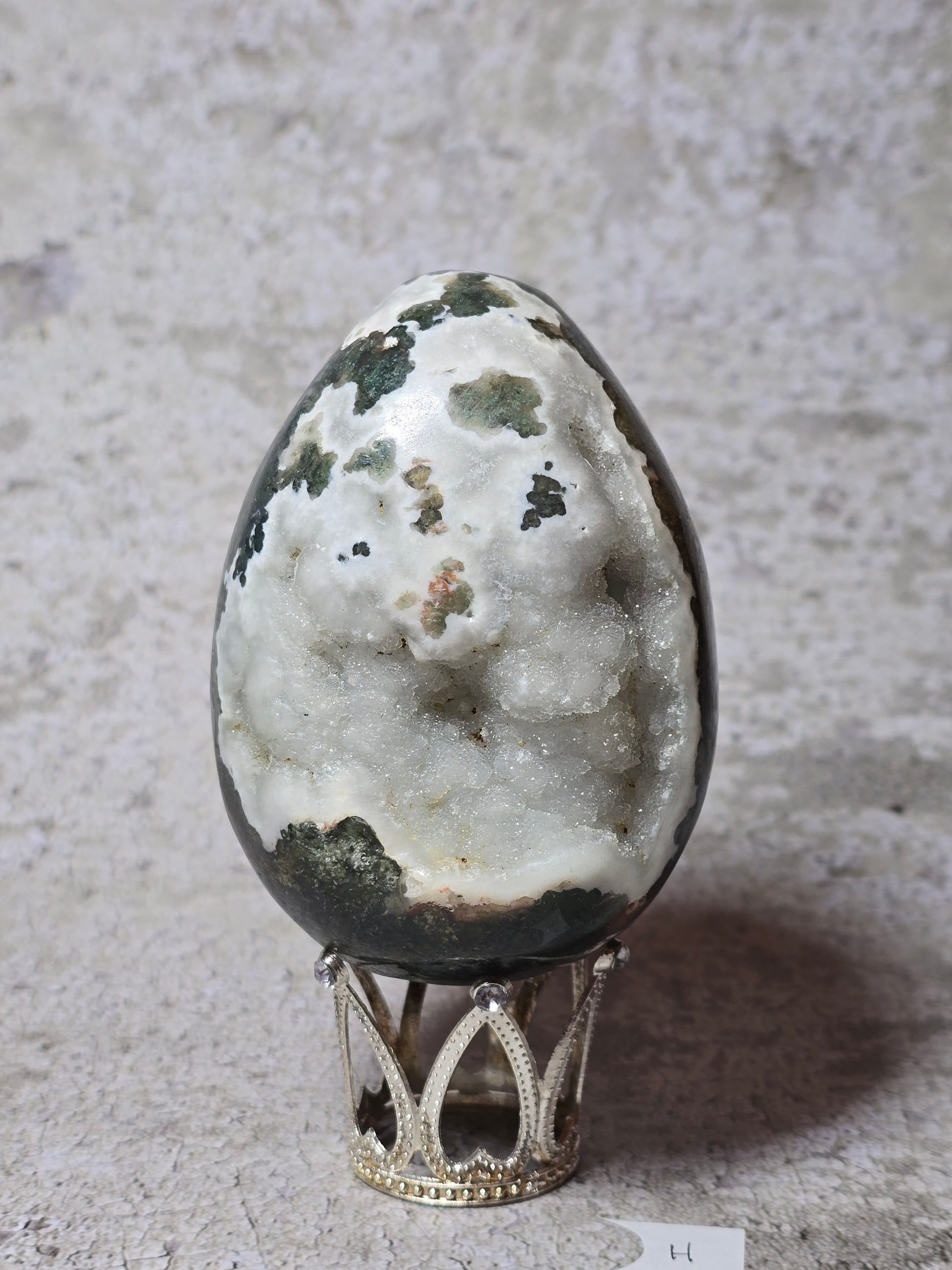 Detta mossagatägg bär naturens lugn i fast form. De gröna mönstren påminner om växtlighet och jord, och stenen förknippas med stabilitet, balans och ny tillväxt.