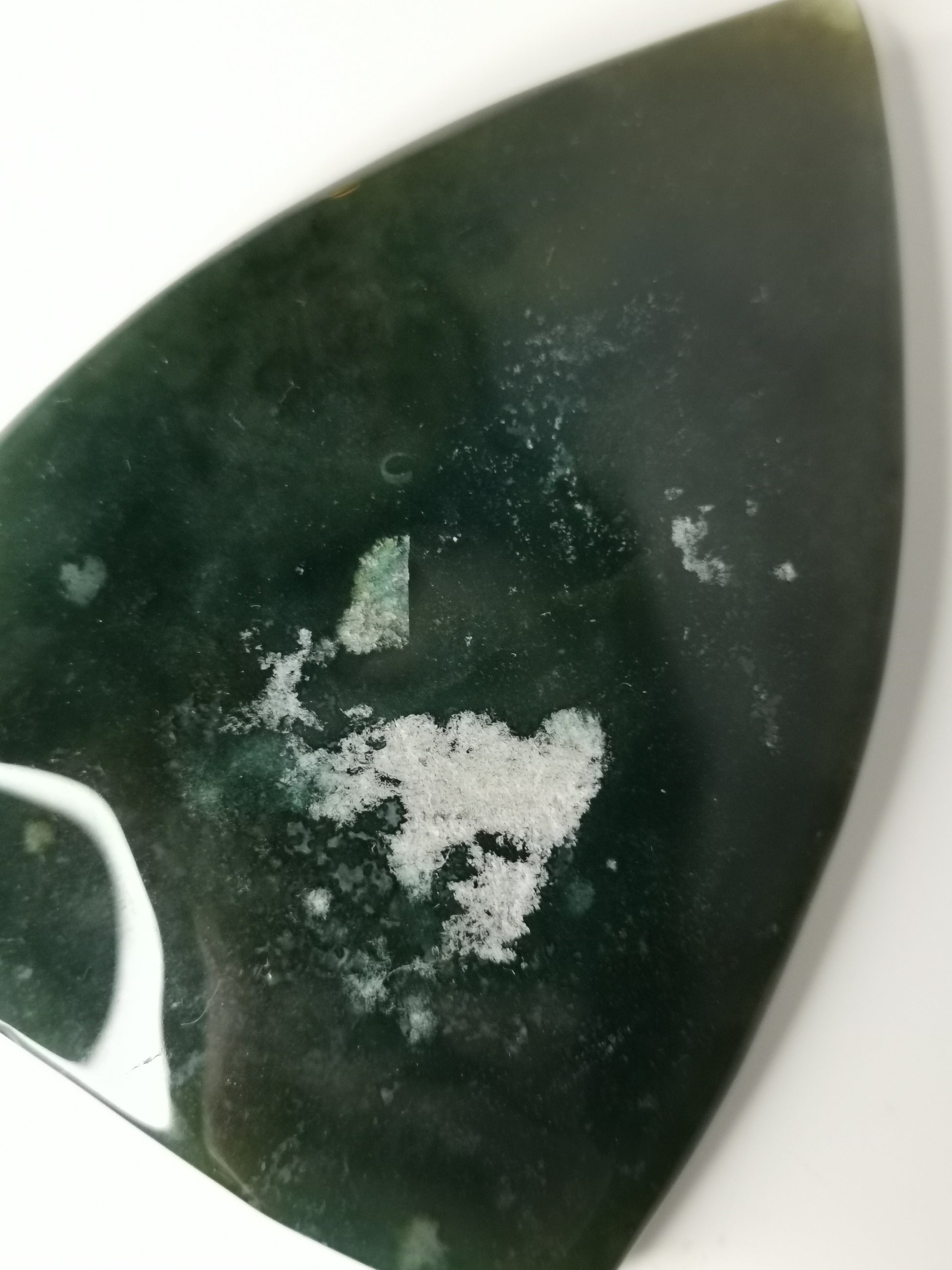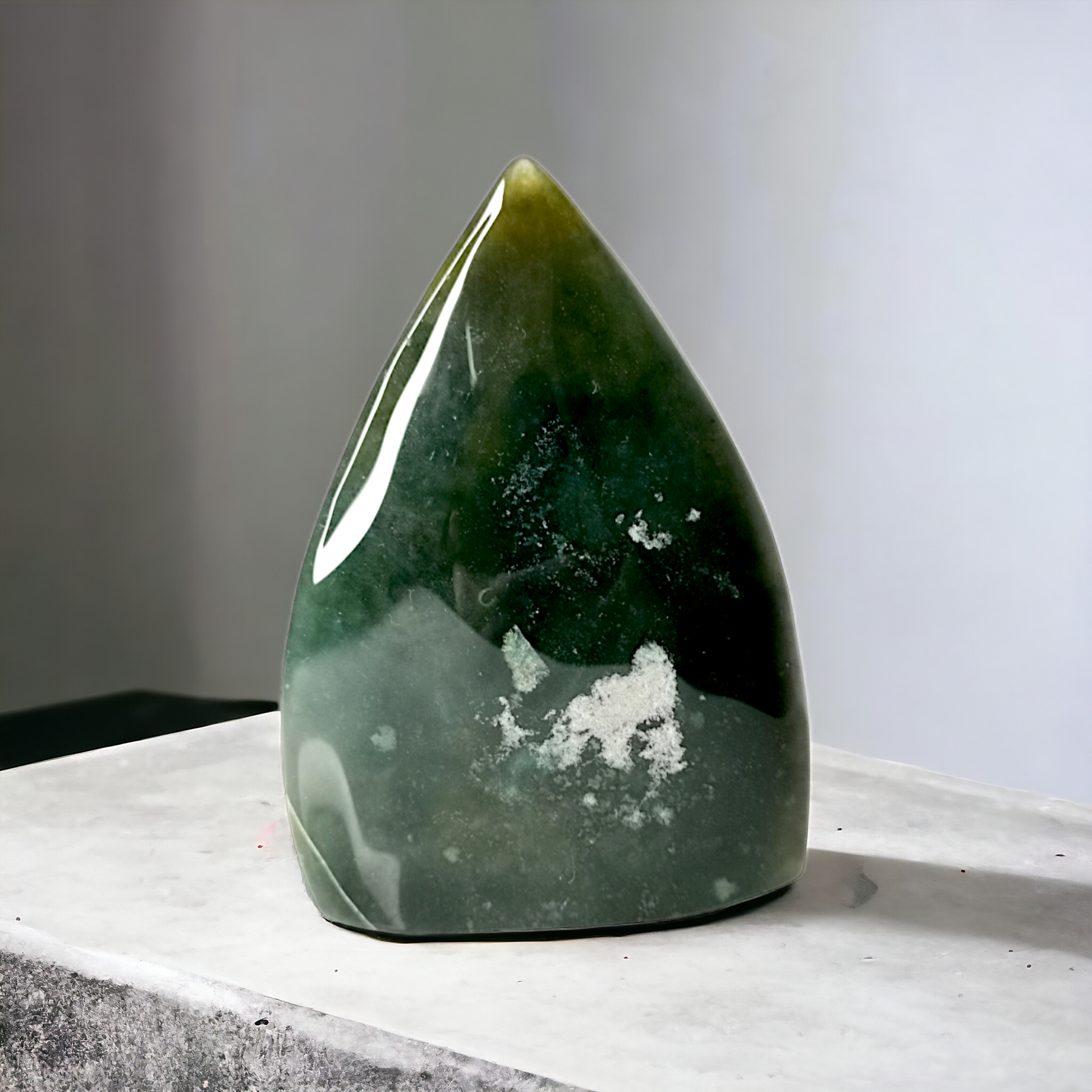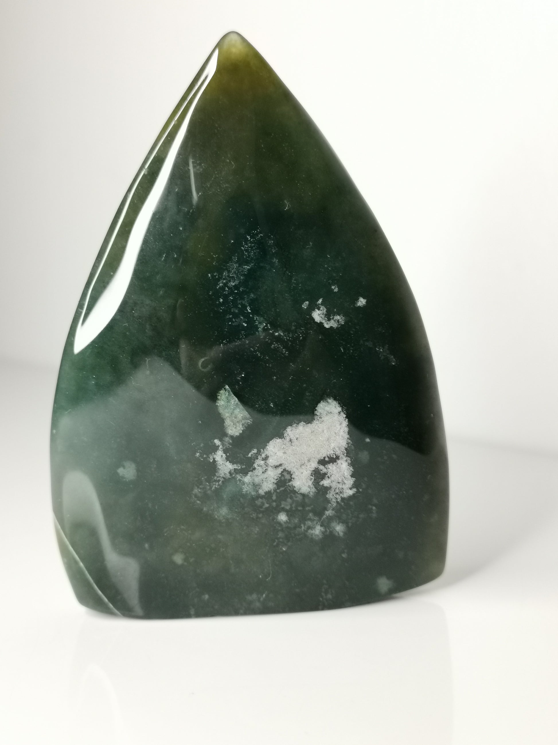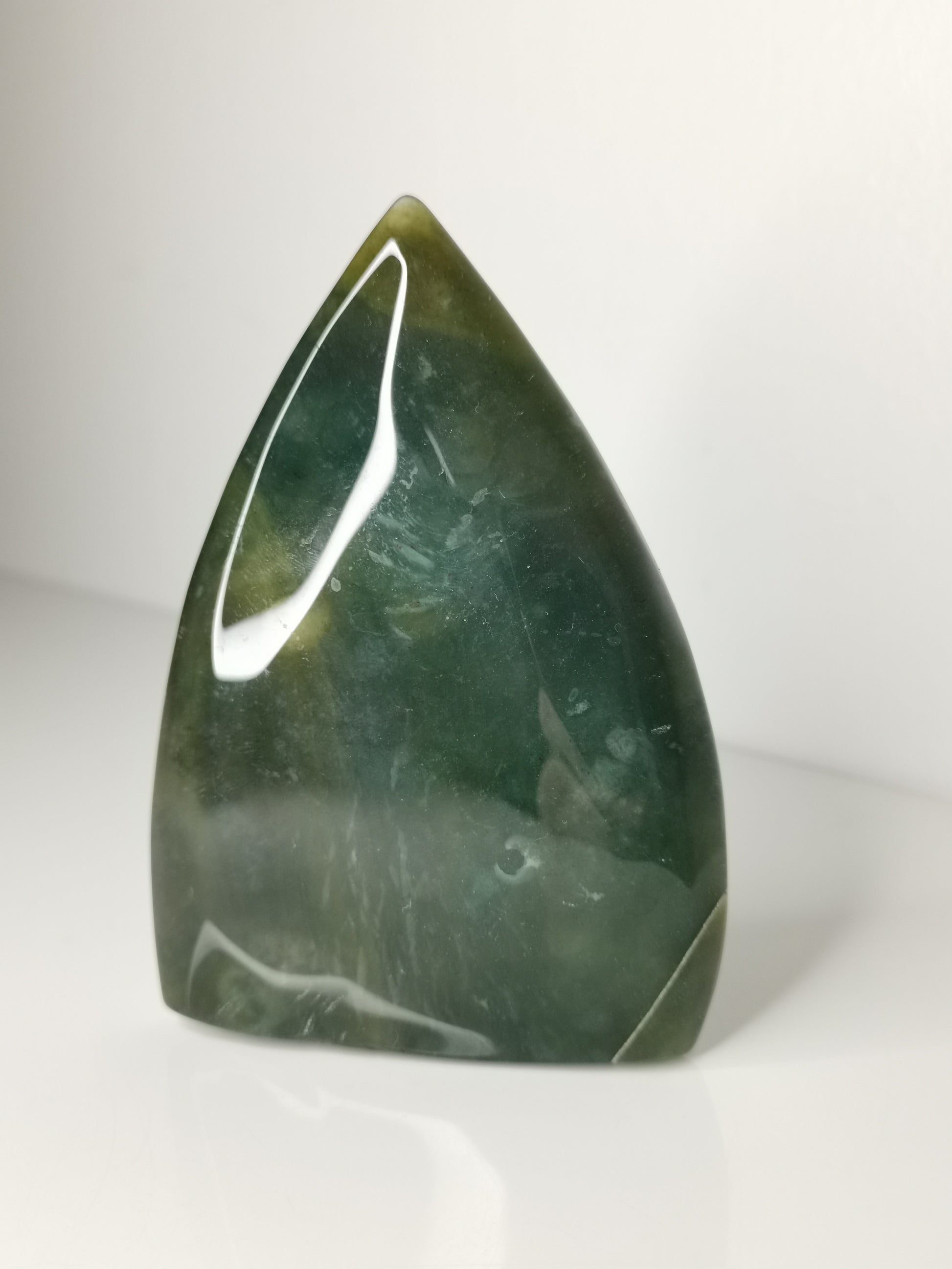 En vacker friform i djup grön jaspis med mjuka färgskiftningar och naturliga mineralpartier. Den kompakta strukturen och den jordiga tonen ger stenen ett stabilt och tryggt uttryck.
