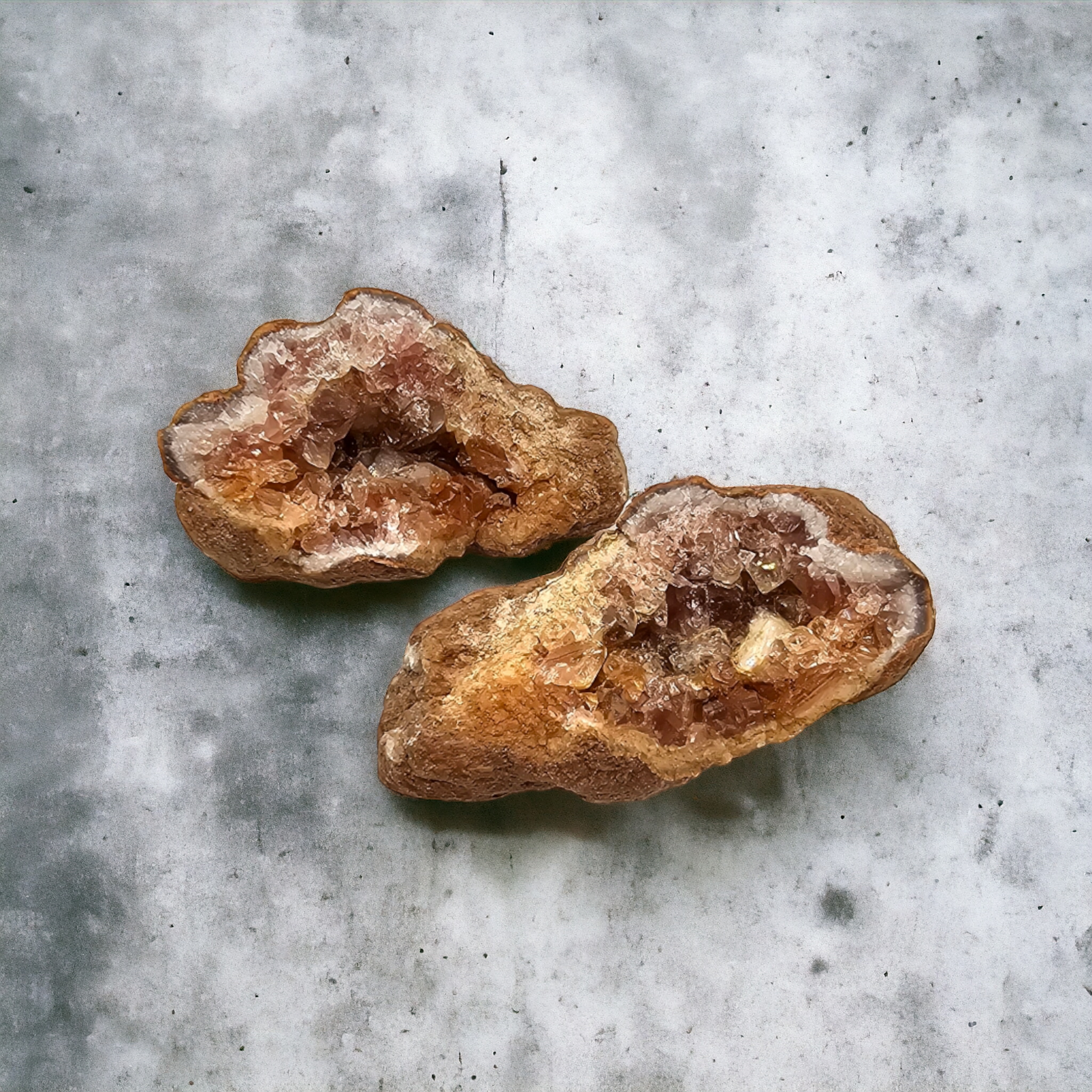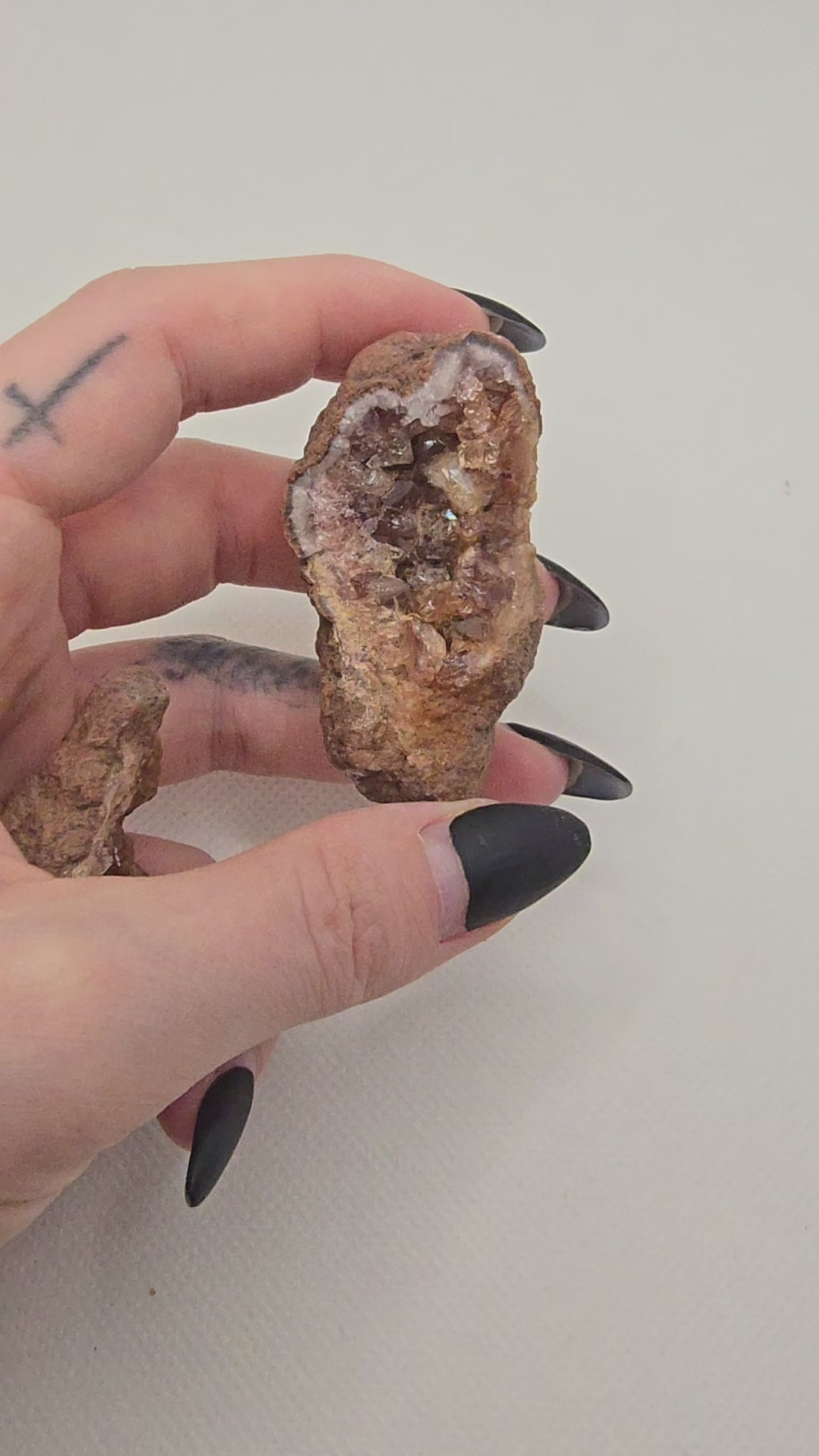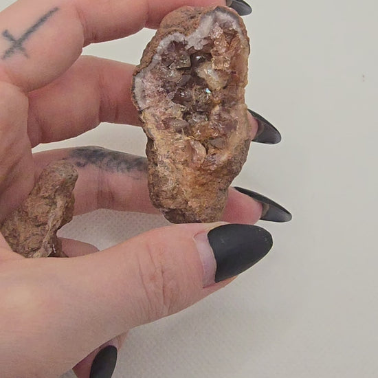 Komplett Geod av rosa ametist. Vi har själva öppnat den här på Kristallnytt. Superfint exemplar! Små flisor kan fattas när man sätter ihop geoden, detta bör du ha med i åtanke vid köp