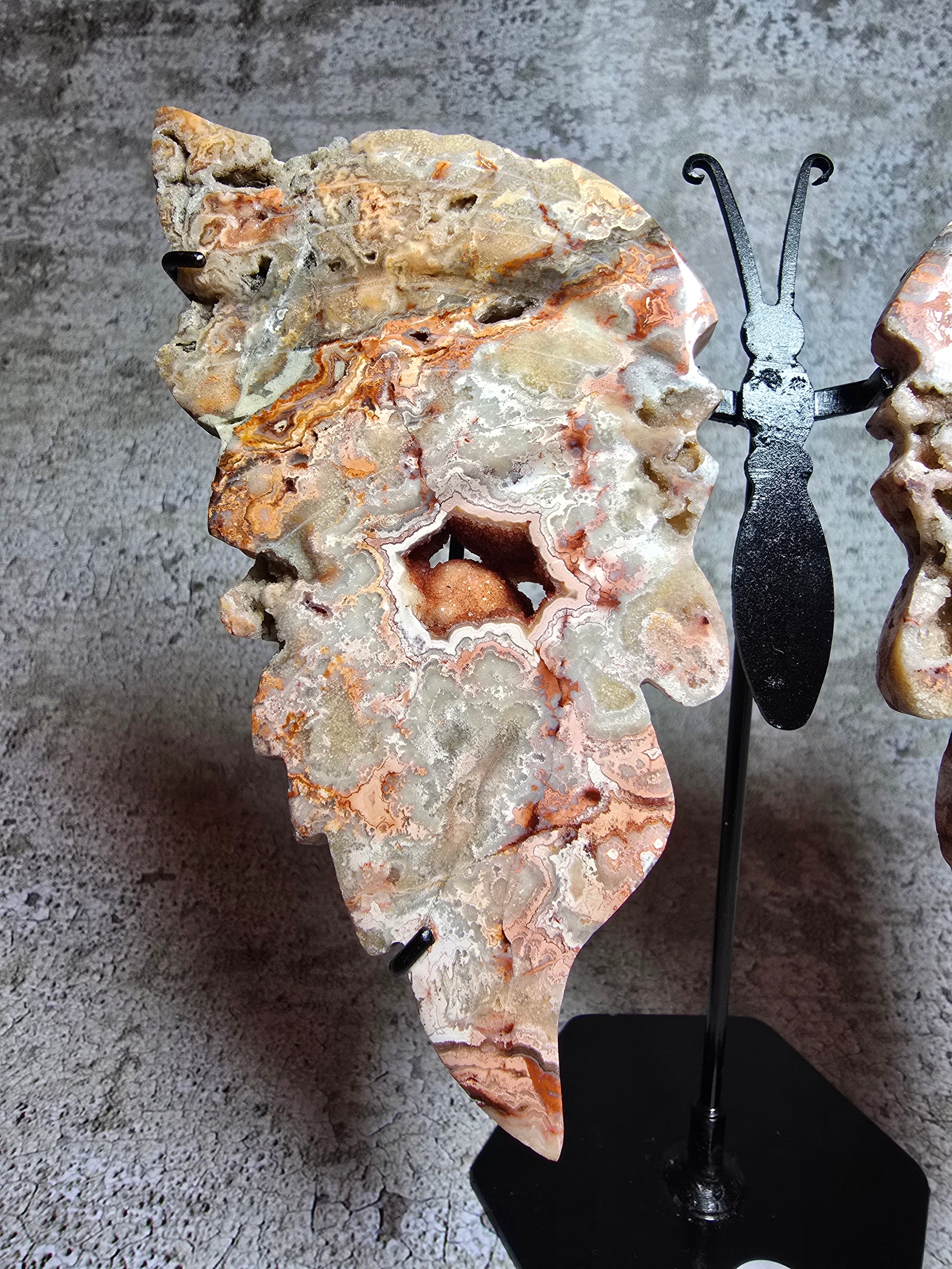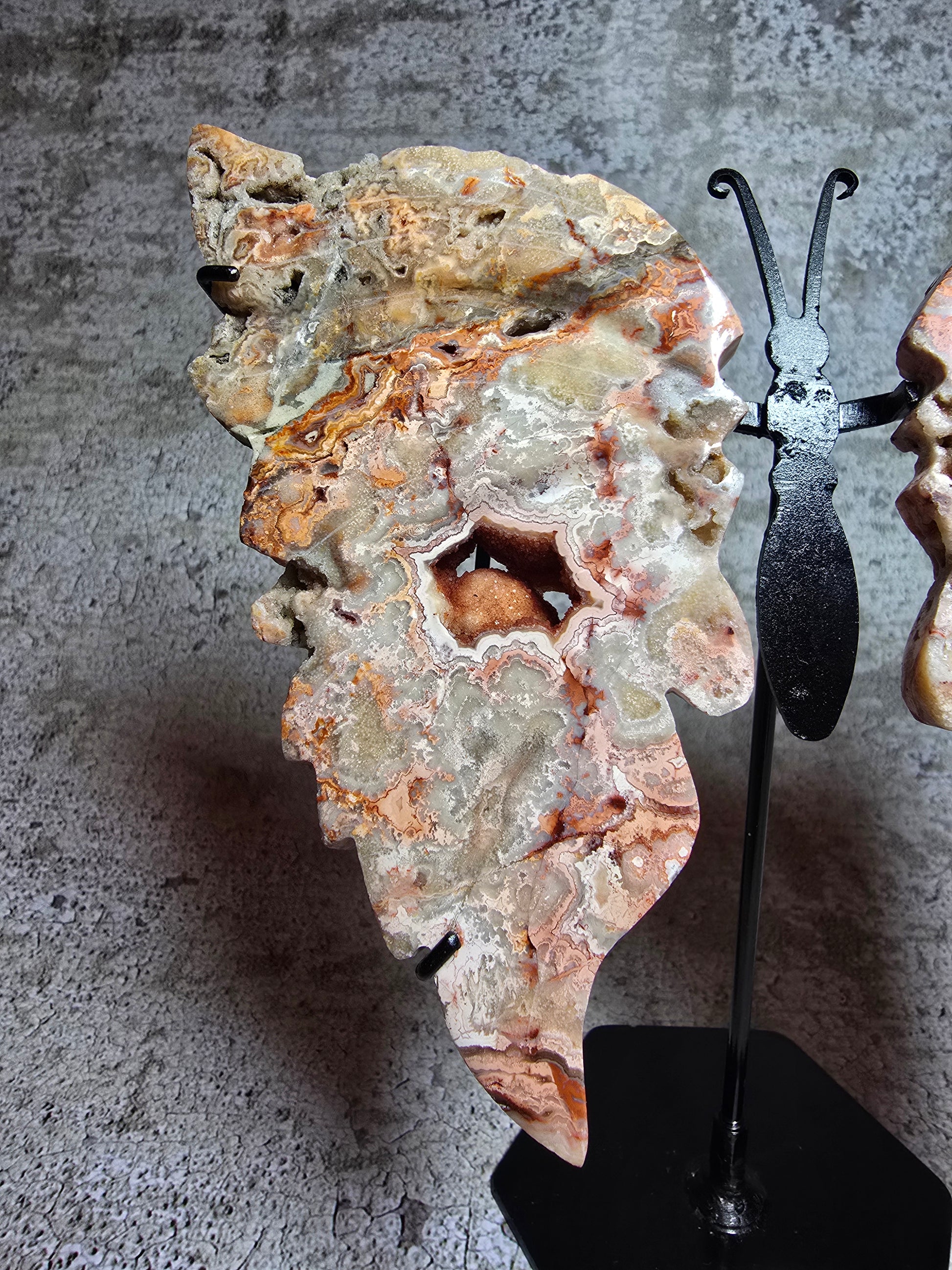 Denna handkarvade pjäs i rosa Crazy Lace Agat bär tydliga mönster, naturliga håligheter och levande druzypartier som skapar djup och karaktär. Det är en fjäril som känns som om den precis landat – eller är på väg att lyfta.