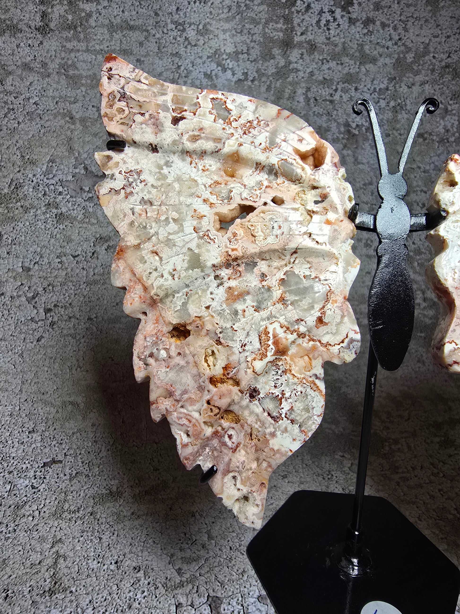 En fjäril född ur sten – handkarvad i rosa Crazy Lace Agat med levande mönster och skimrande druzypartier som fångar ljuset som små hemligheter.