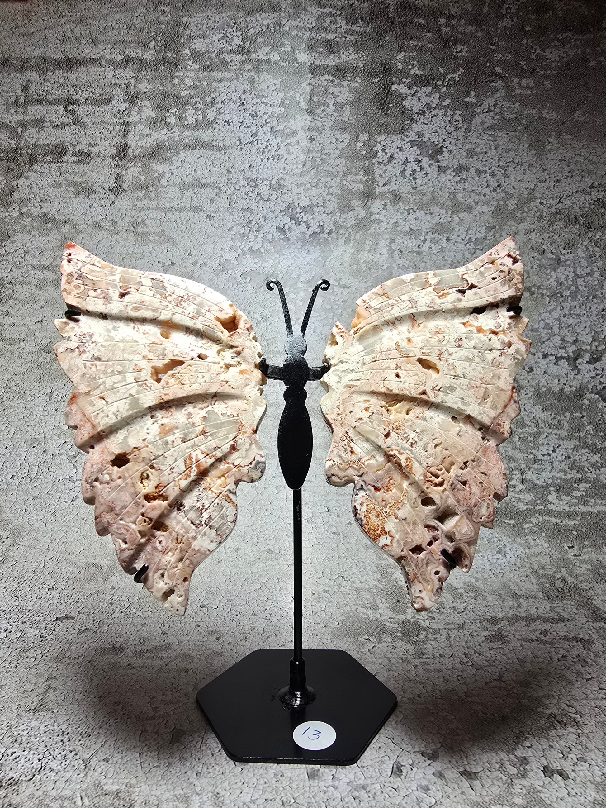 Observera: Varje fjäril är unik i struktur, druzypartier och mönster – det är just det som gör den levande.