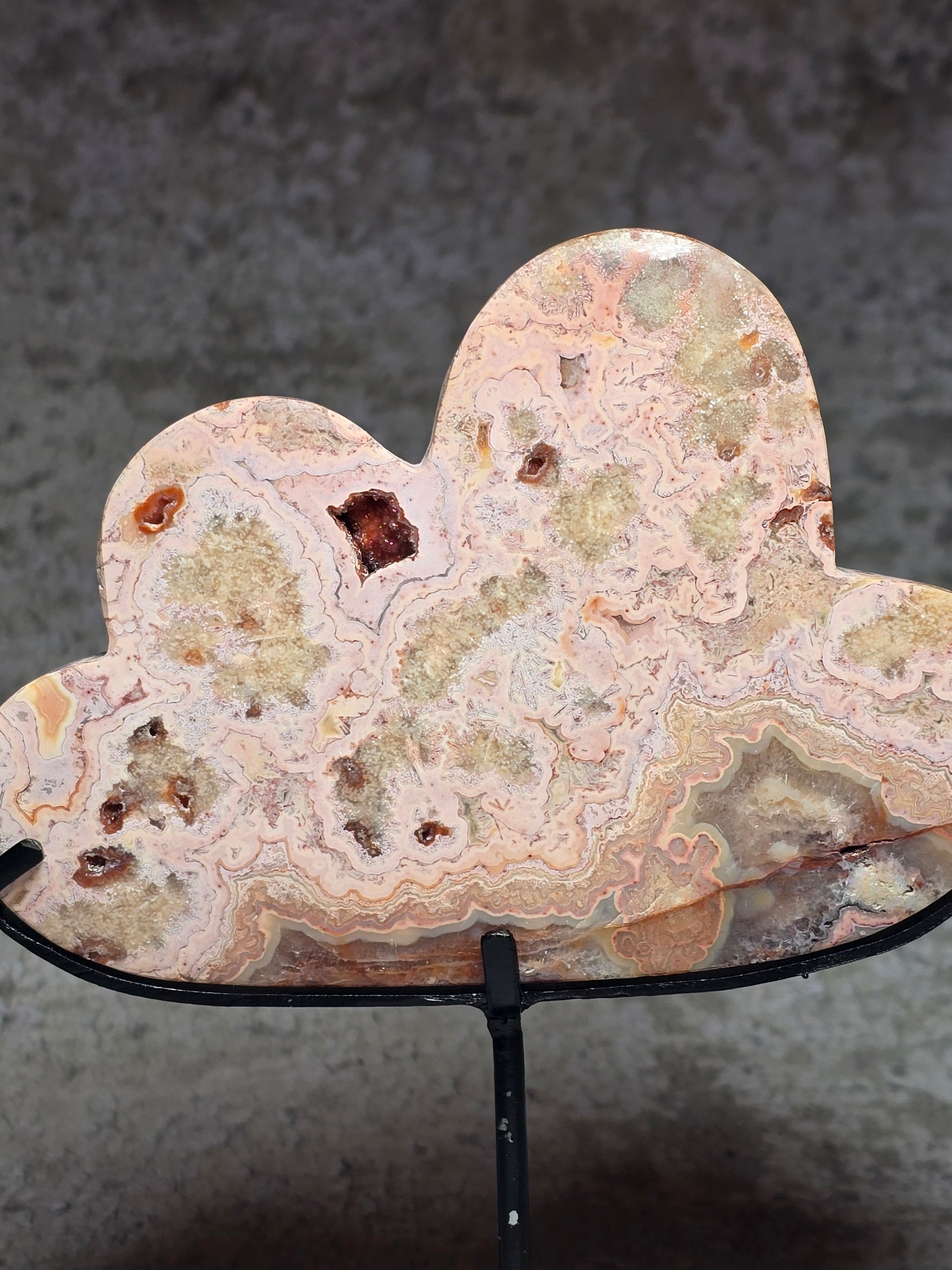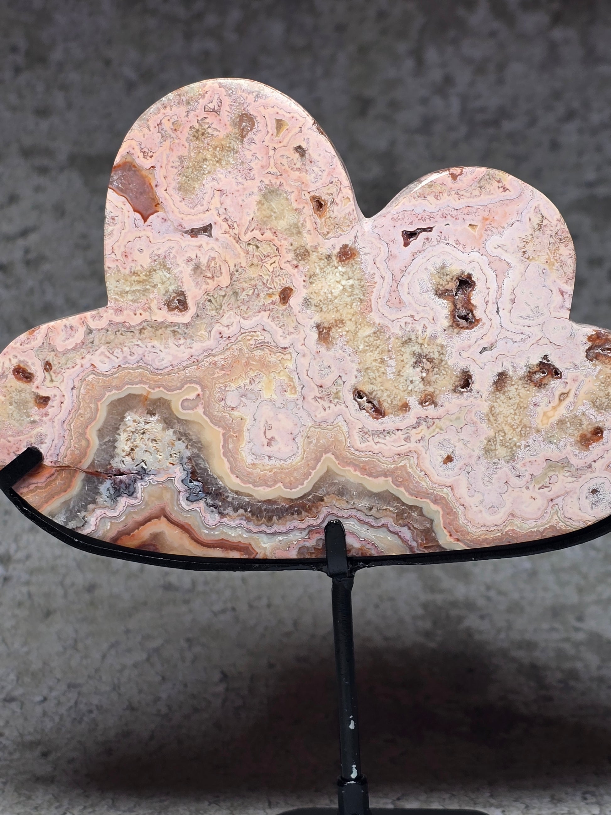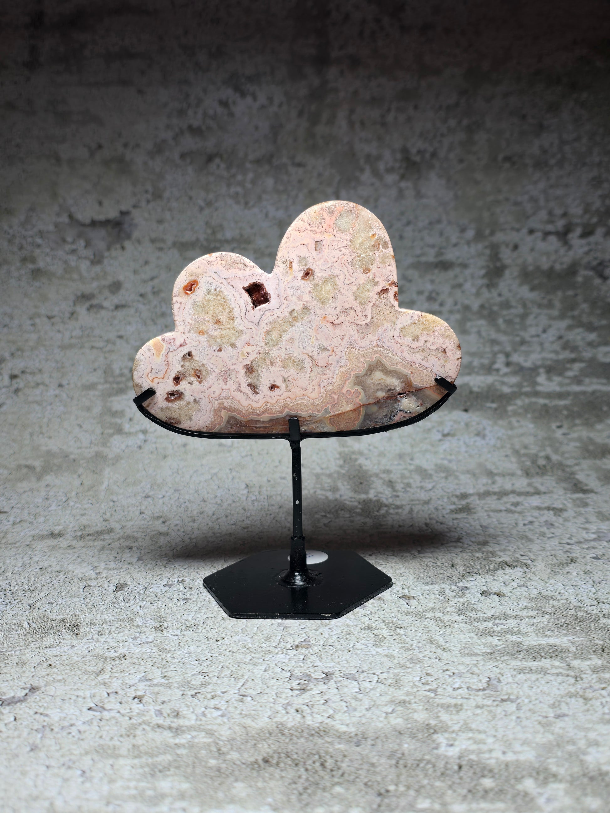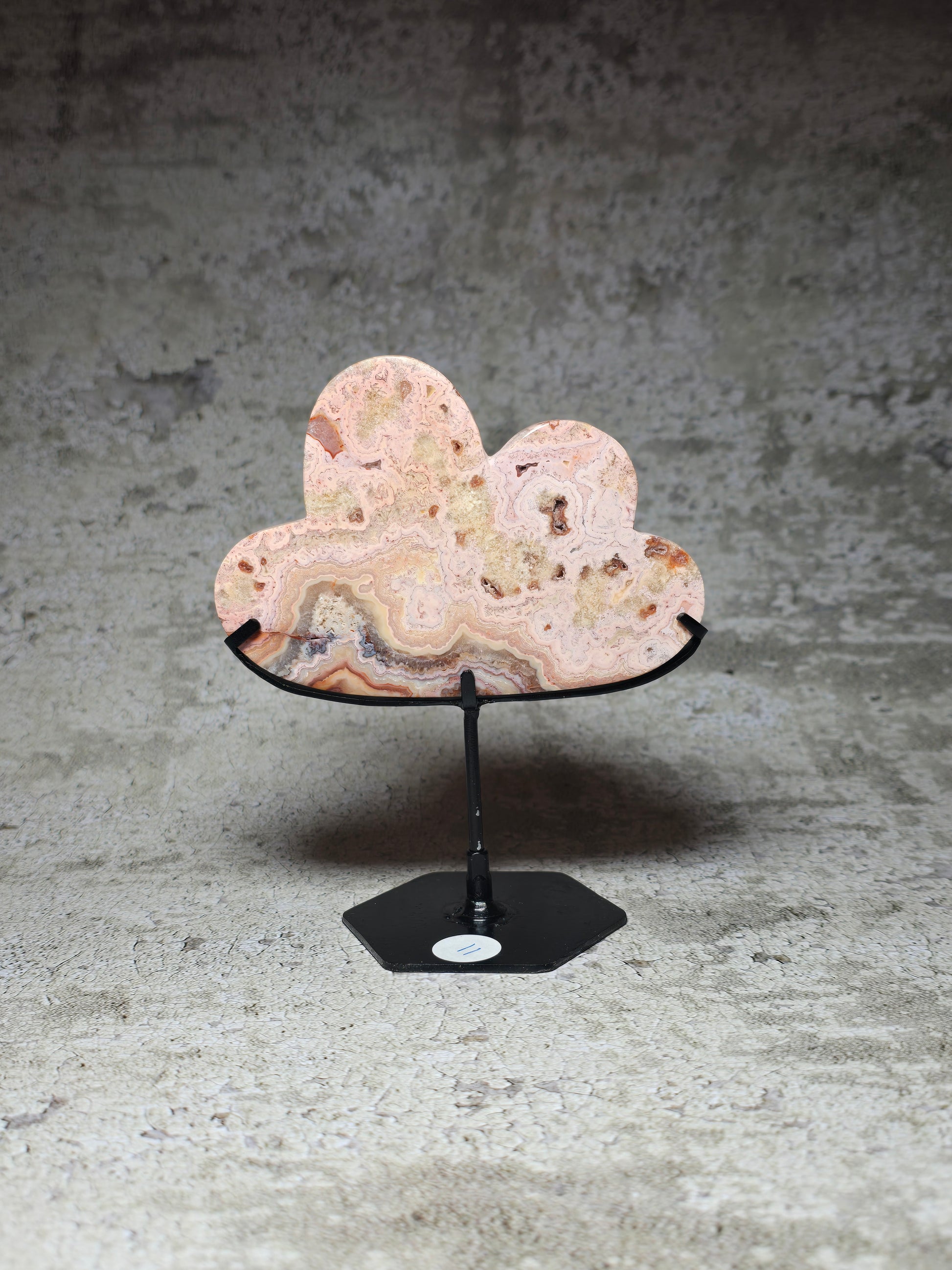 Detta handkarvade moln i rosa Crazy Lace Agat bär ljusa lager, varma toner och naturliga druzypartier som glittrar som små stjärnor i en gryningshimmel. Formen symboliserar hopp, lätthet och att våga lyfta blicken.