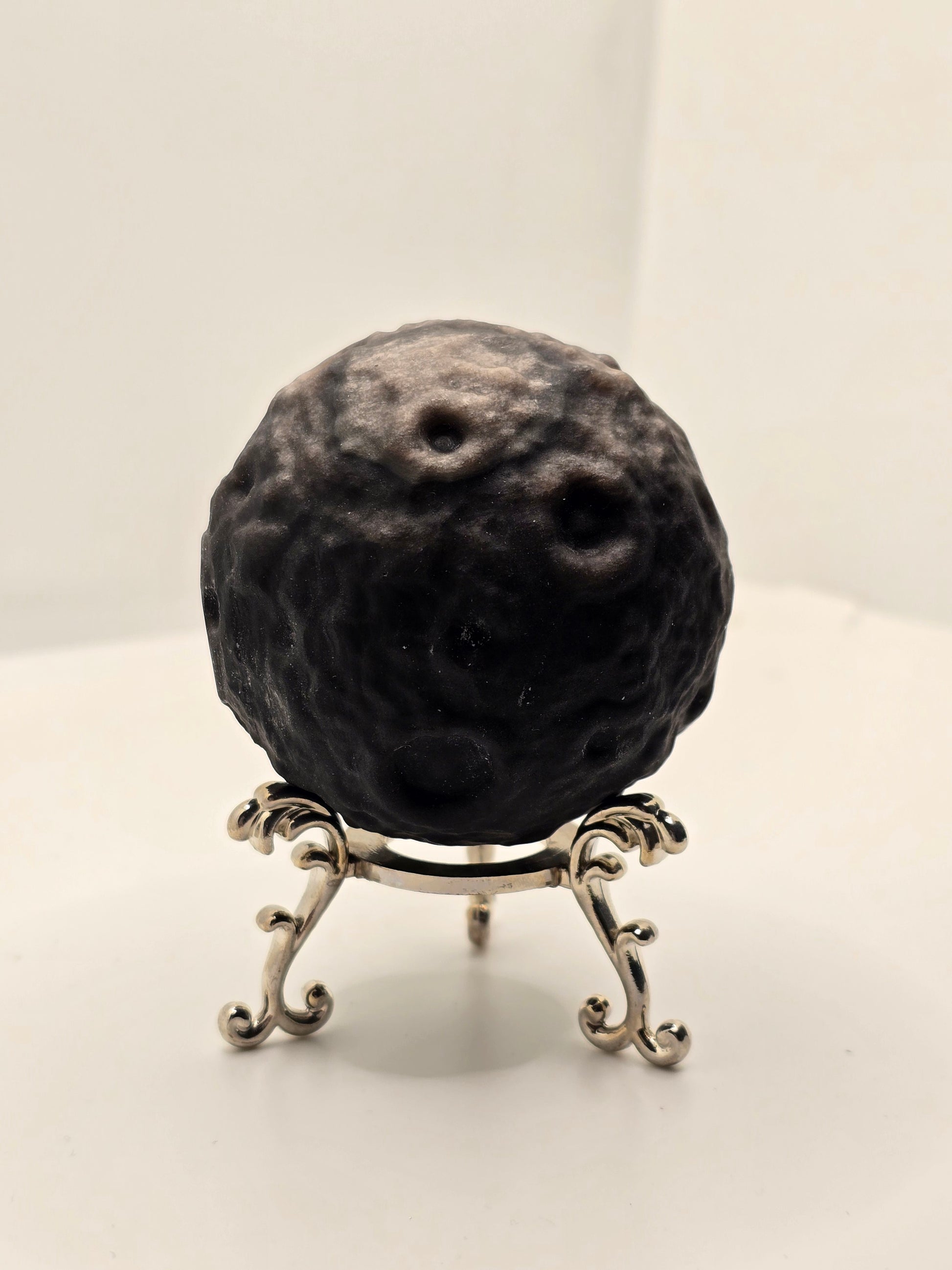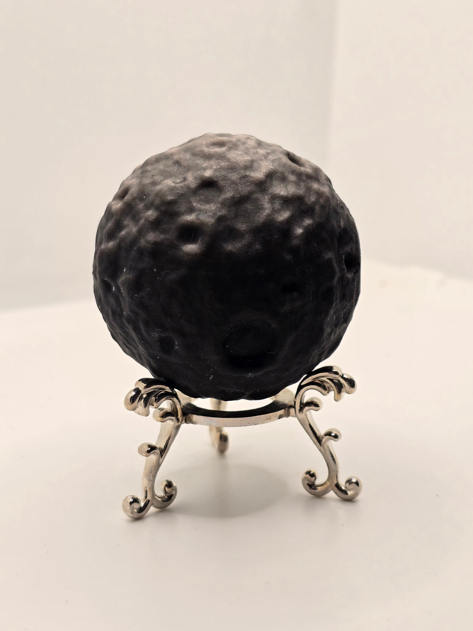 En kraftfull och mystisk måne i silver sheen obsidian – en sten som bär både djup och spegling. Den silverskimrande effekten träder fram i ljuset och symboliserar klarhet mitt i mörkret.