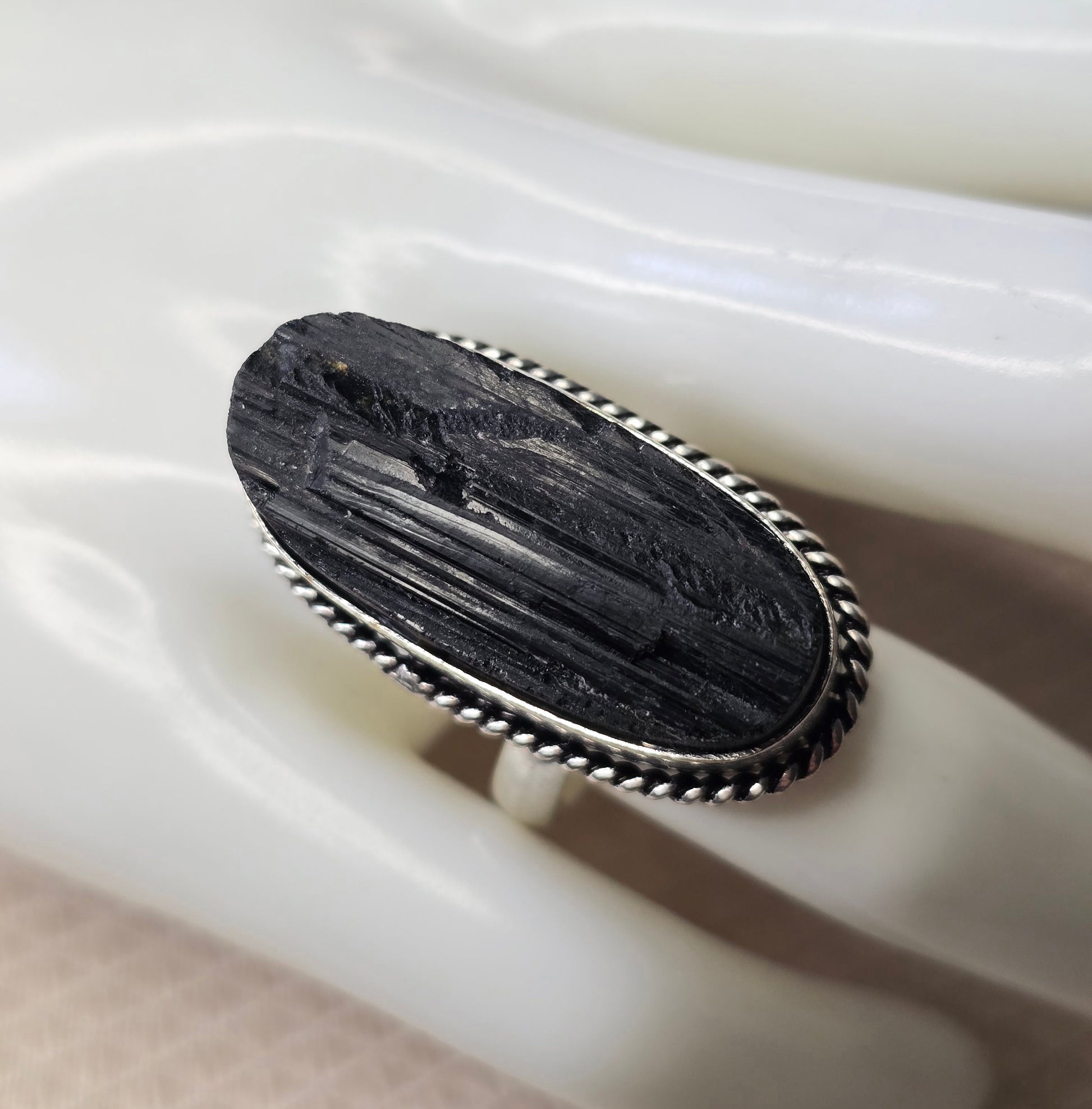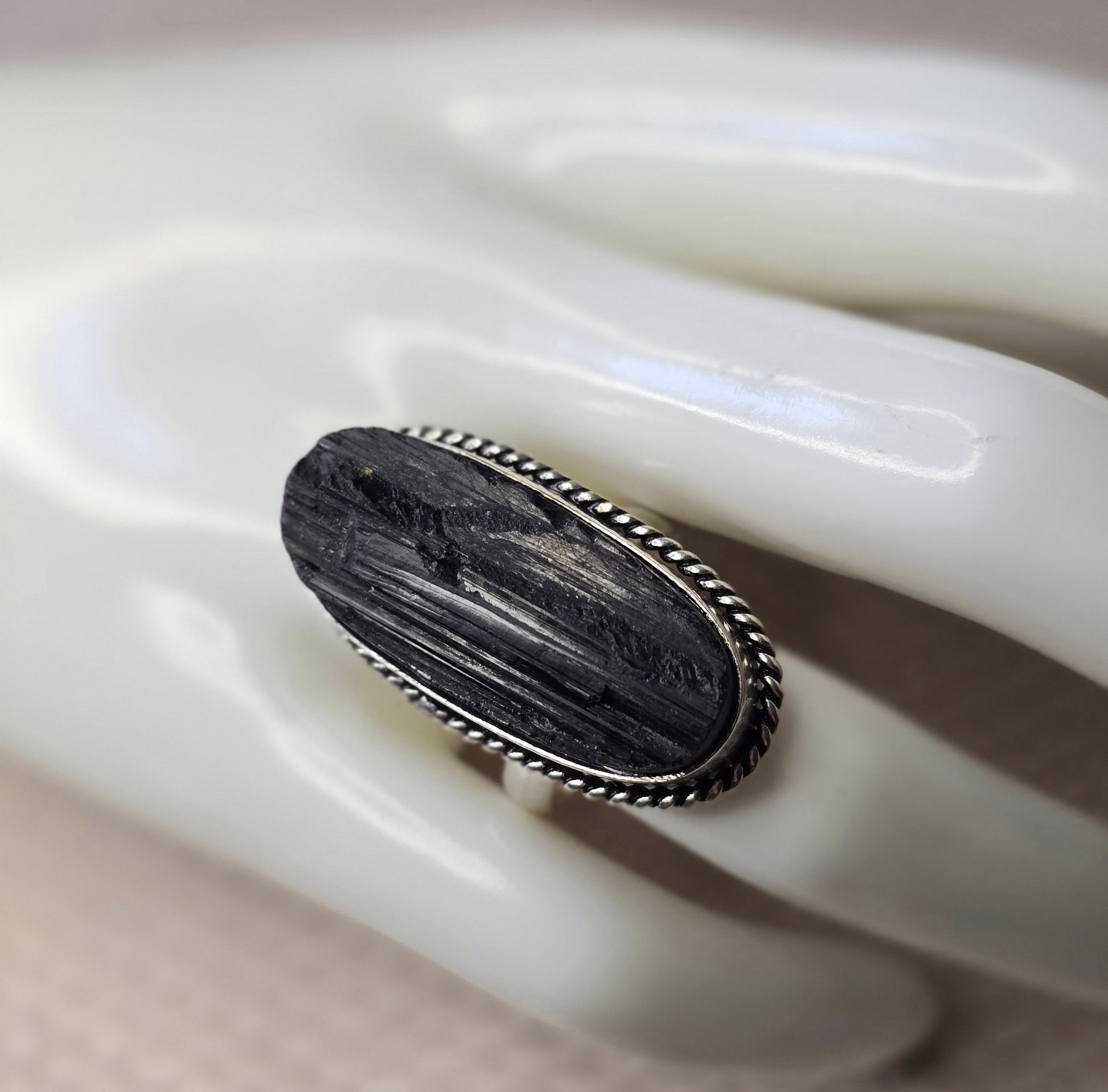 Denna ring bär en rå, orörd bit svart turmalin – stenen som i århundraden setts som portvaktaren mot allt tungt och allt som inte hör hemma i ditt fält.