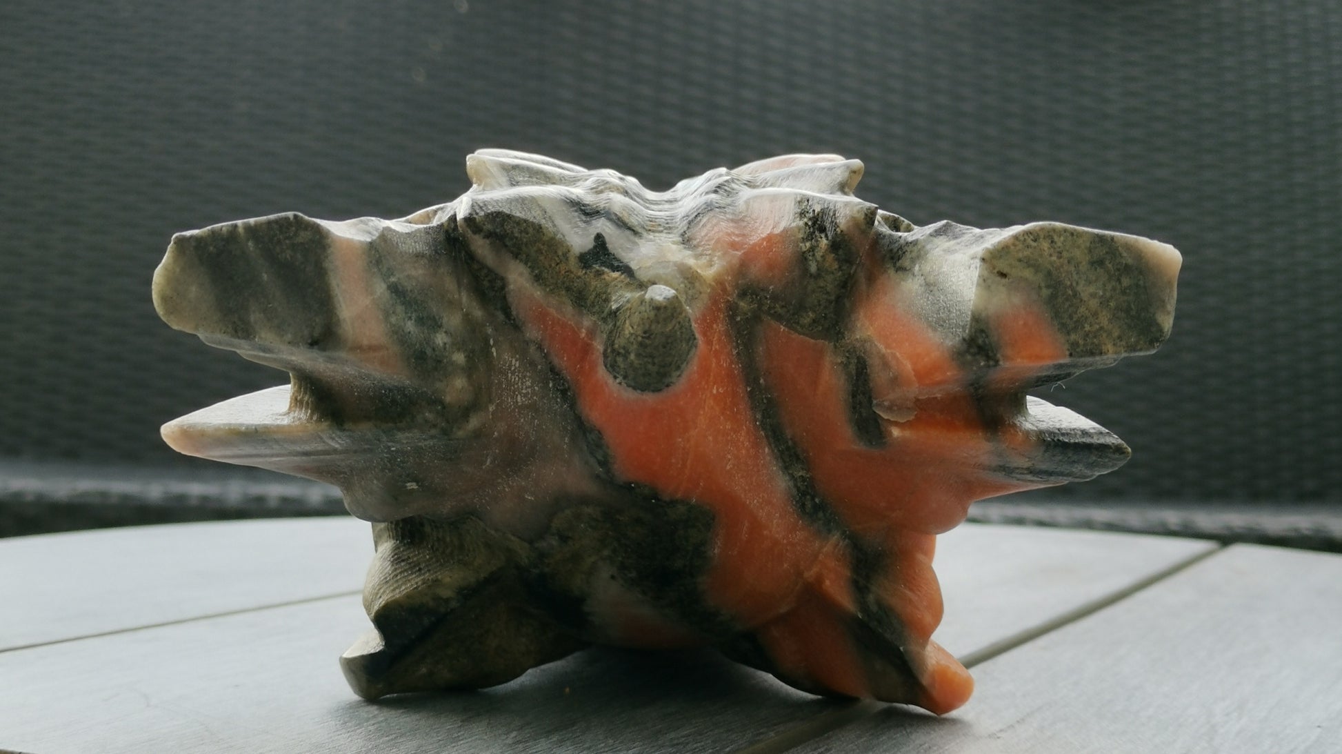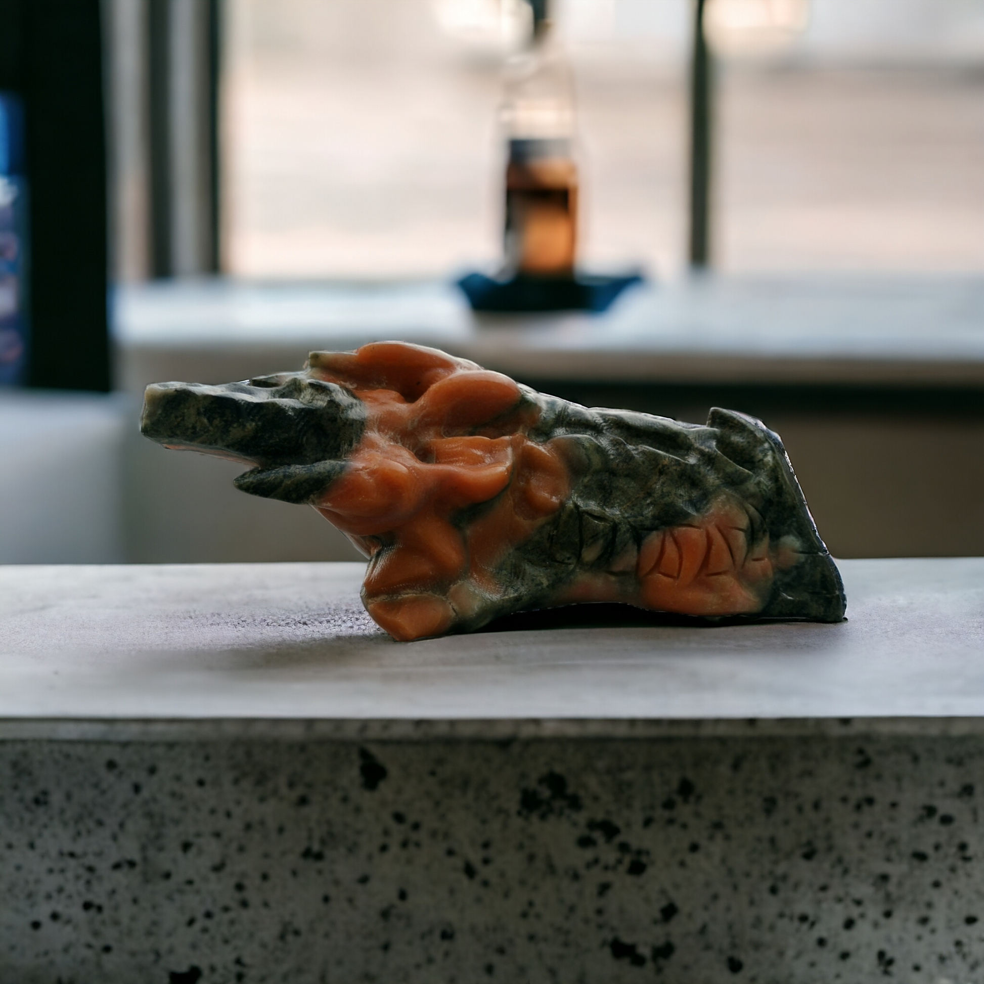 Denna handsnidade XXL-drakskalle är skapad i en naturlig kombination av grön och orange kalcit, där stenens egna färgskiftningar får styra form och uttryck. Varje exemplar är unikt, med levande nyanser, mjuka övergångar och naturliga mönster som ger karaktär och djup.